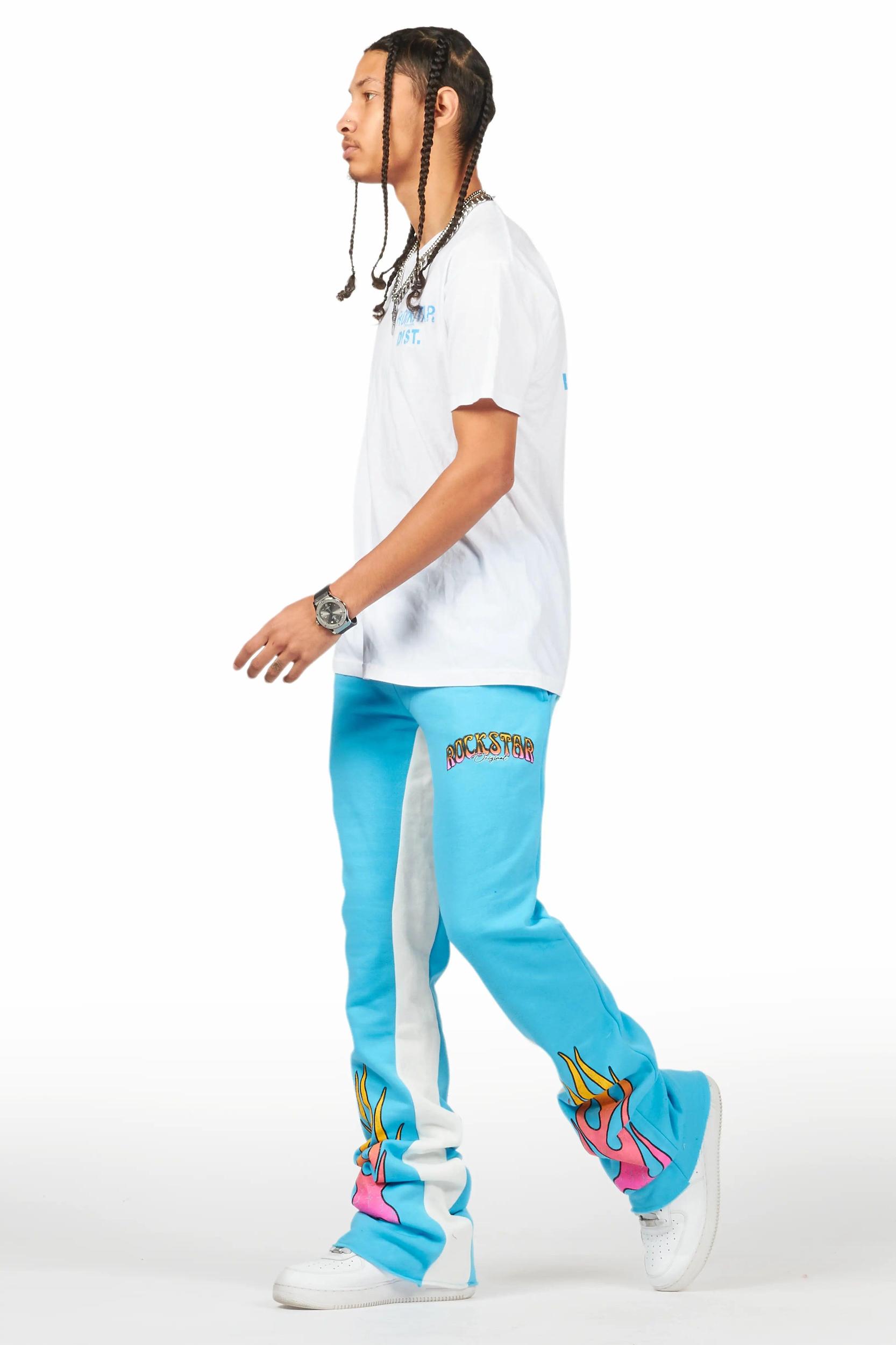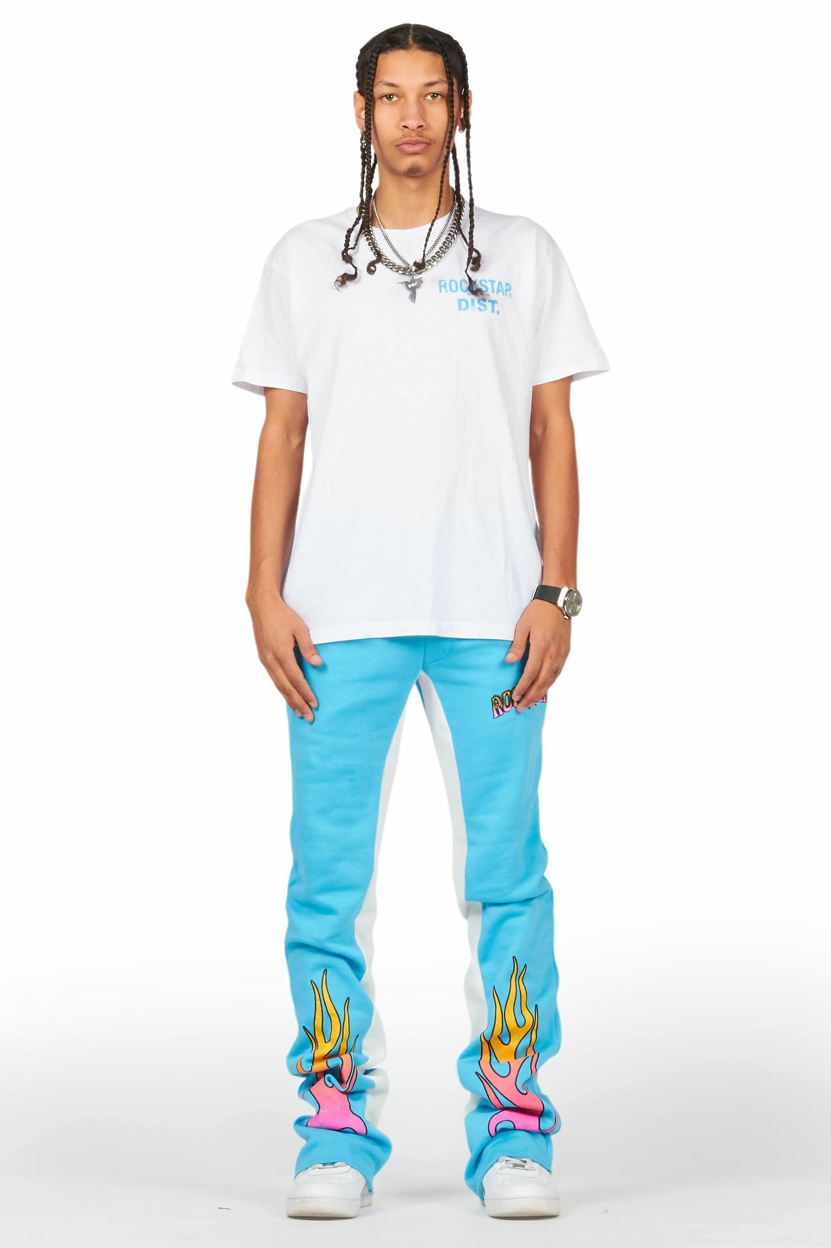 A pair of urban baggy sweatpants for men in blue. Designed with ultra soft organic cotton and extra long legs for a dope streetwear style. Drawstring waistband Dual slant pockets Baggy construction Oversized-fit Color block designing Printed RSO logo