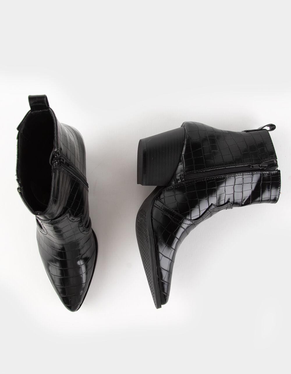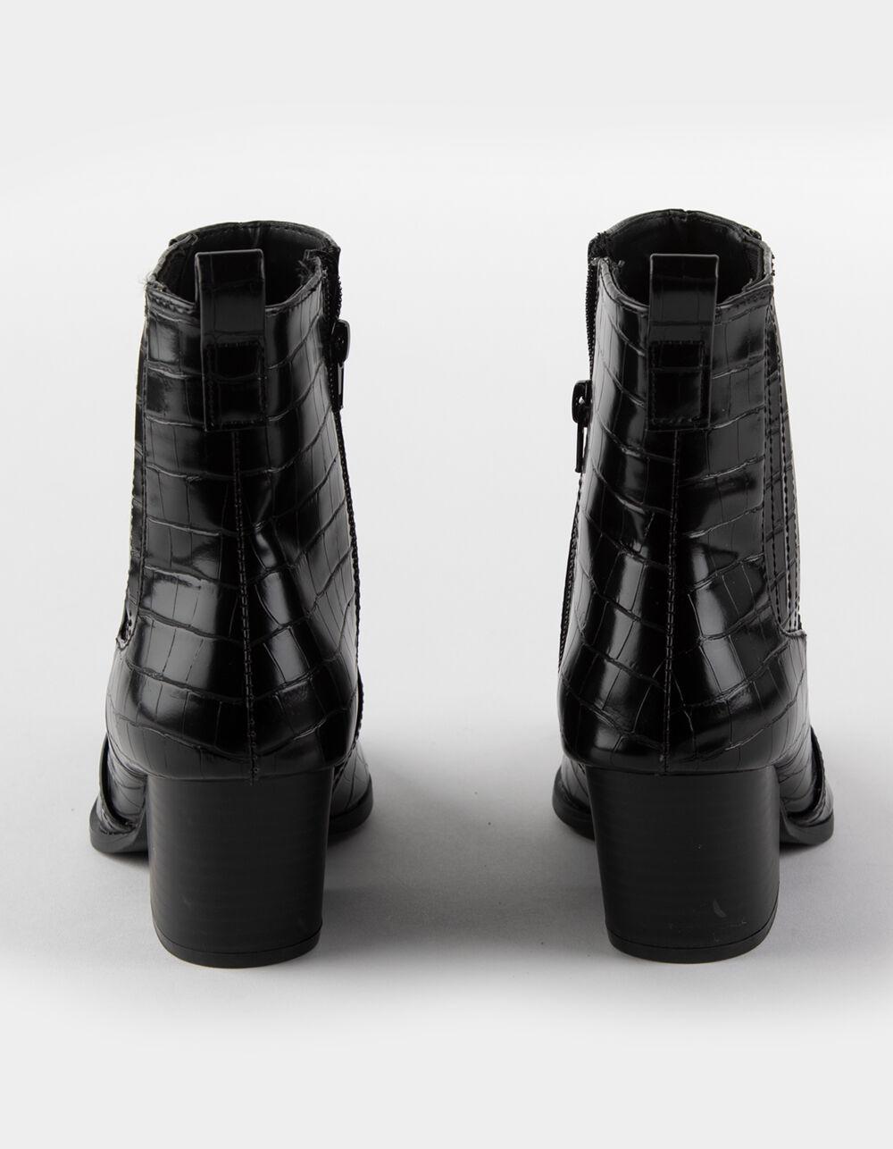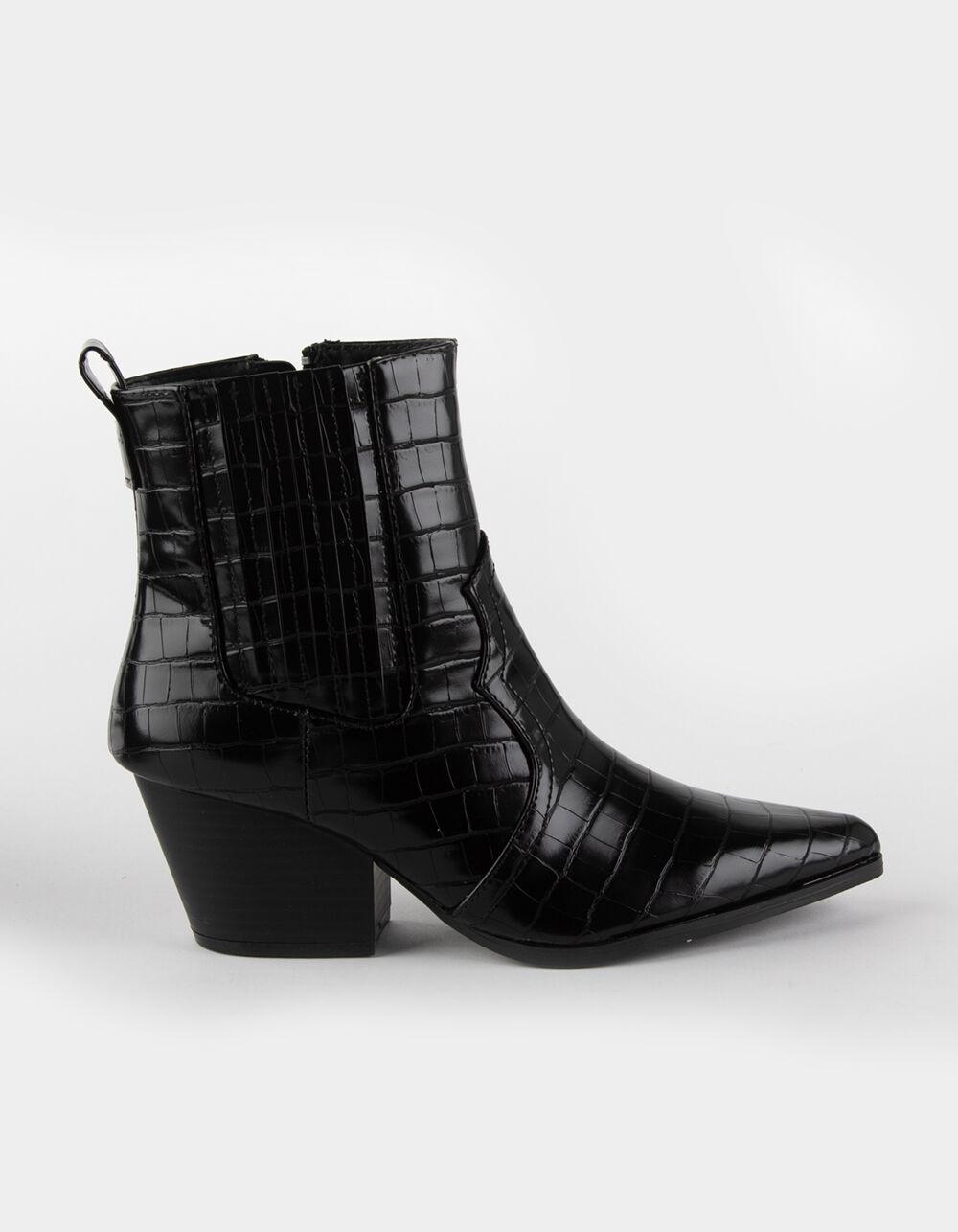 Qupid Vaca Western Boots. Faux crocodile skin design. Elastic panels on sides. Side zip closure. Stacked heel. Heel tab. Pointed toe. PU Leather. Rubber sole. Heel height.: 2.5" Imported.