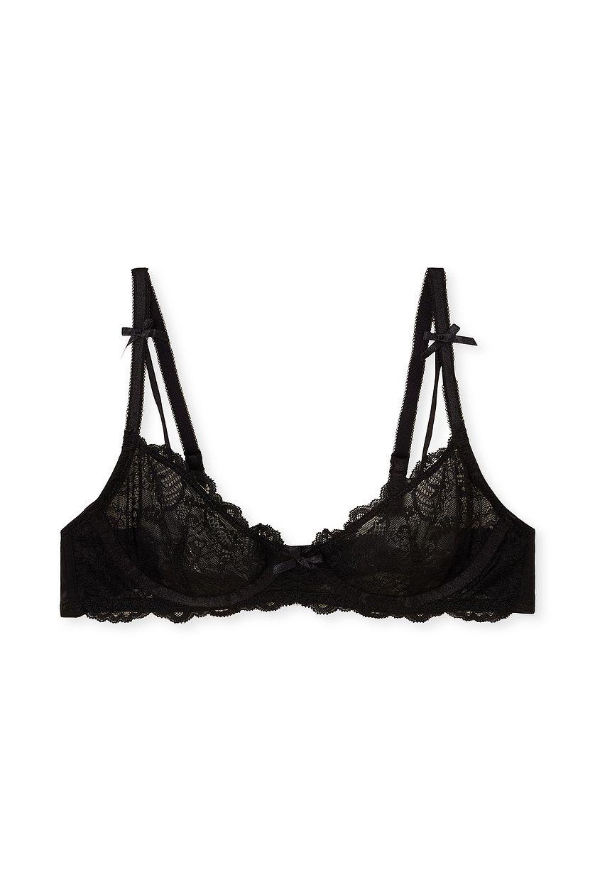 This bra features an unpadded underwire cup and a stretchy sheer material. It has a floral pattern and a strap detail. Our bra has adjustable shoulder straps with a bow detail, a lace detailed hem and an adjustable hook and eye fastening on the back.