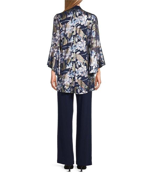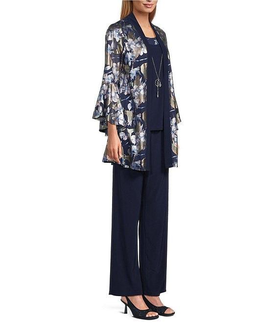 From R & M Richards, this features: Jacket: Power mesh fabrication Open front construction Long sleeves Foil floral print Bell sleeve detail Pullover closure Approx. 34" in length Polyester/spandex Hand wash/dry flat Tank: Solid ITY fabrication Round neckline Sleeveless Tank silhouette Detachable necklace included Pull on construction Approx. 24" in length Polyester/spandex Hand wash/dry flat Pants: Solid ITY fabrication Straight leg pant Pull-on construction Approx. 31" inseam Polyester/spandex Hand wash/dry flat Imported.