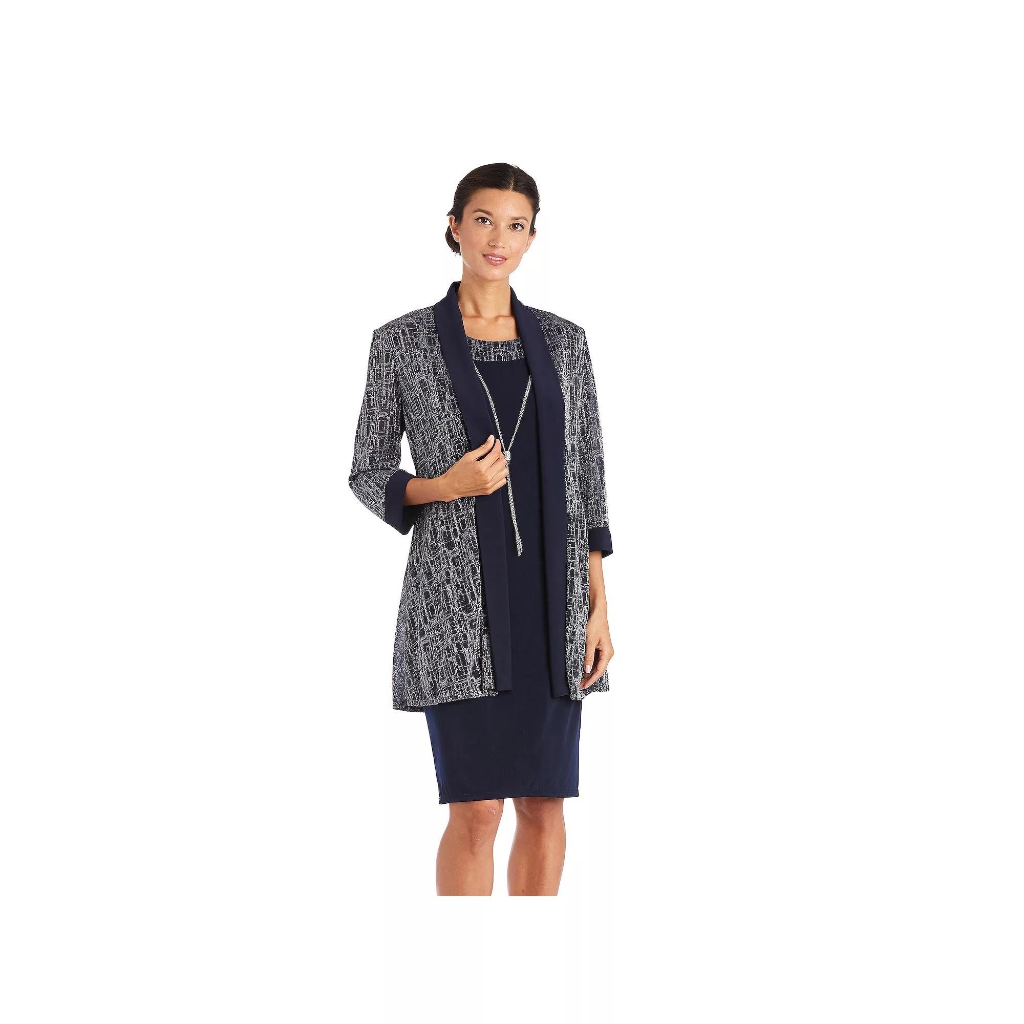 From R&M Richards, this jacket dress features:Jacket:metallic jacquard knit fabrication3/4 sleevesopen front necklineapprox. 32 lengthnylon/metallic/polyester/spandexhand wash/dry flatDress:metallic jacquard knit fabricationshift silhouetteround necklinesleevelesslinedcenter back zip closureapprox. 39.5 lengthnylon/metallic/polyester/spandexhand wash/dry flatImported.