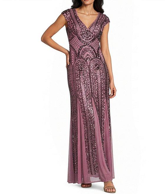 R & M Richards Cap Sleeve V-Neck Godet Insets Embroidered Sequin Long Dress