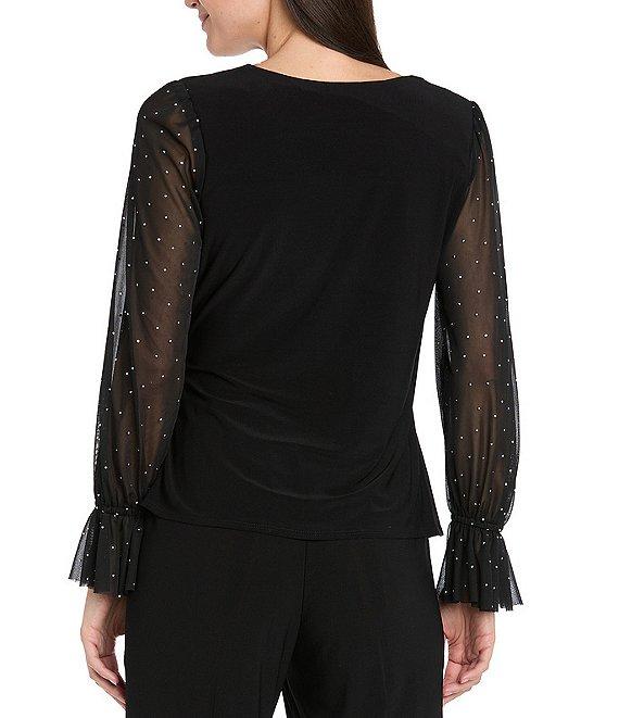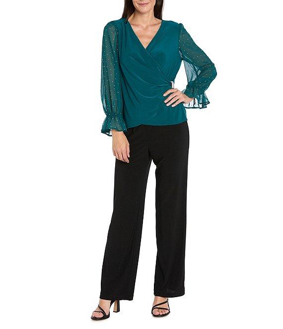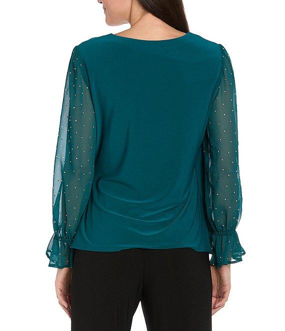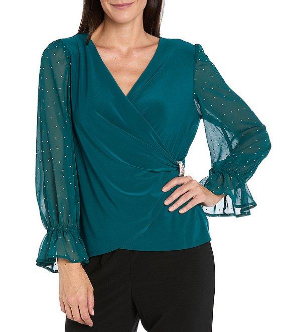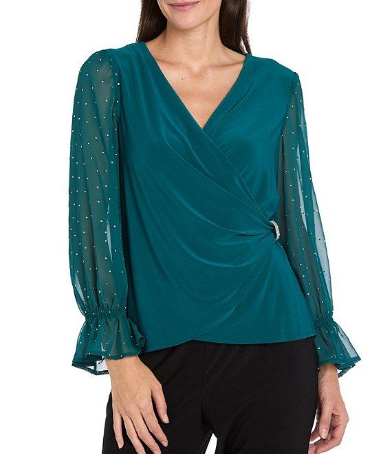 From R&M Richards, this top features: Bodice ITY fabrication Sleeves hi multi chiffon fabrication V-neckline Balloon long sleeves Studded sleeves Wrap top silhouette Lined Pullover construction Approx. 24" in length Polyester/spandex Hand wash/dry flat Imported.