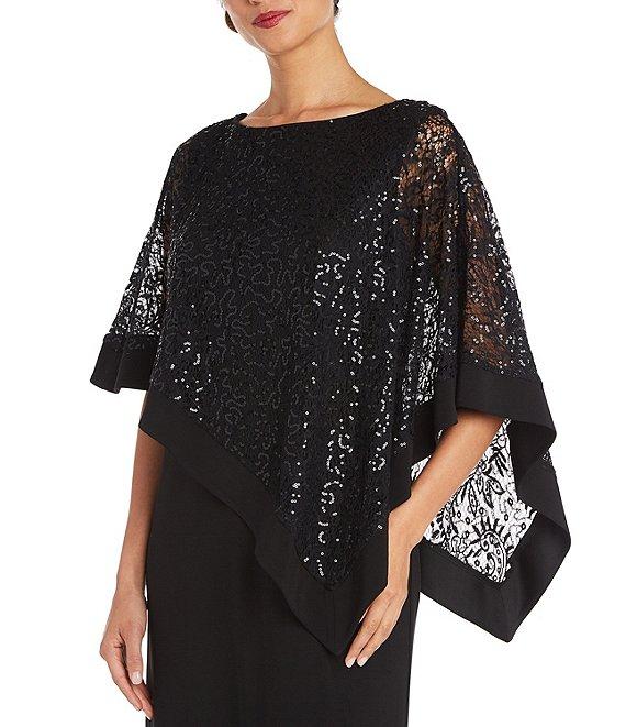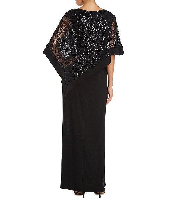 From R & M Richards, this gown features: Solid ITY/EMB sequin lace fabrication Sheath silhouette Round neckline elbow length sleeves Asymmetric overlay Lined Pullover Front Slit Approx. 58" in length Polyester/spandex Hand wash Imported.