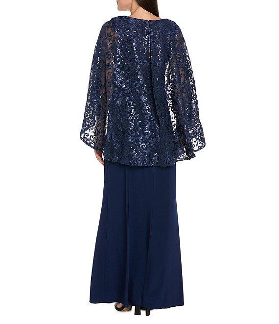 From R & M Richards, this dress features: Embroidered scroll sequin power mesh fabrication Sweetheart neckline Cape sleeves Lined Center back zipper closure Approx. 60" in length Polyester/spandex Hand wash Imported.