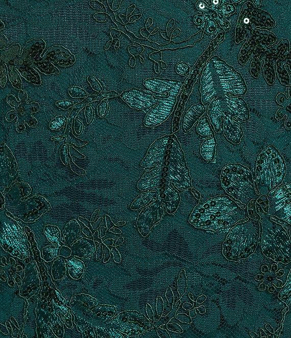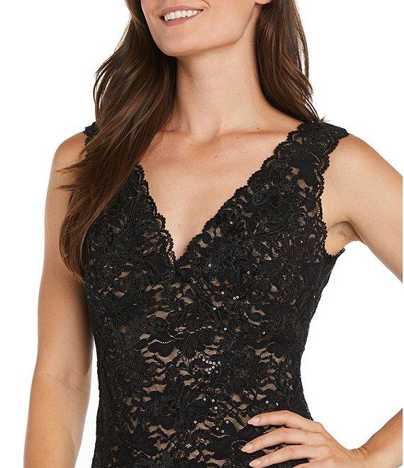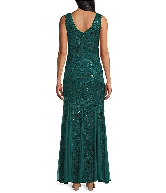 From R & M Richards Petite, this dress features: Cord stretch lace fabrication V-neckline Sleeveless Embroidered sequin floral print Lined Mesh godet skirt Center back zipper closure Approx. 57" in length Nylon/rayon/spandex Hand wash/lay flat Imported.
