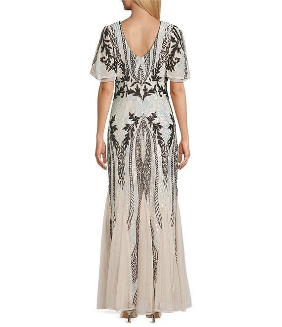 From R & M Richards, this dress features: Embroidered sequin power mesh fabrication Two tone iris sequins V-neckline Short double layer sleeves Godet skirt Empire waist silhouette Lined Center back zipper closure Approx. 59" in length Polyester/spandex Hand wash only Imported.