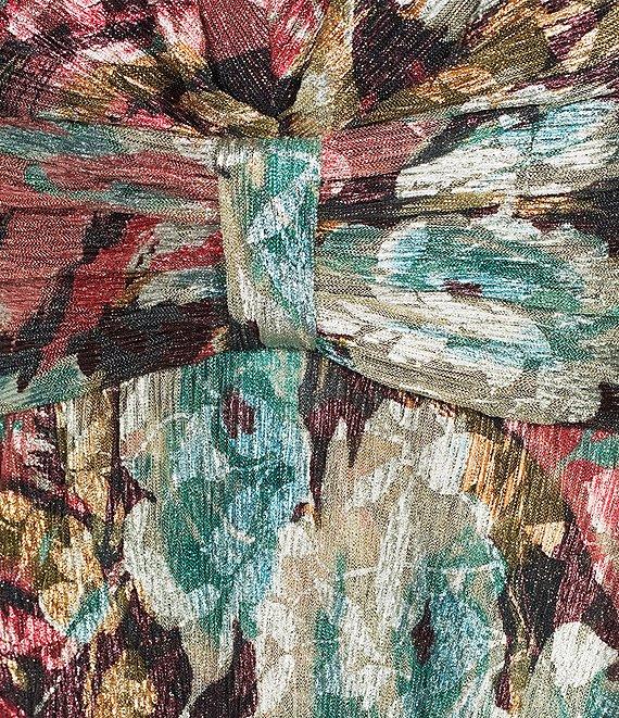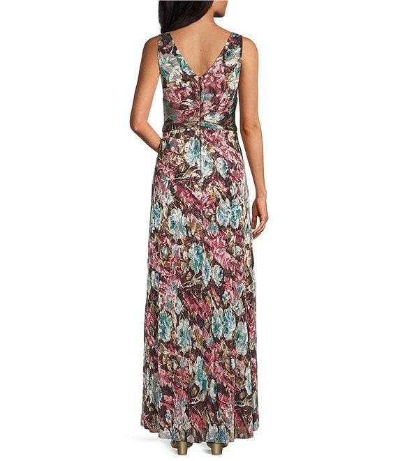 From R & M Richards, this dress features: Foil metallic crinkle fabrication V-neckline Sleeveless Floral print Ruched waistline Mesh inset Lined Center back zipper closure Approx. 59" in length Polyester/metallic Hand wash/dry flat Imported.