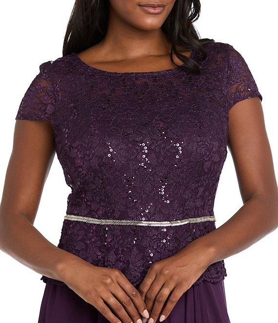From R & M Richards, this dress features: Glitter scallop added lace fabrication Matte jersey chiffon fabrication Round neckline Cap sleeves Beaded waistband Scallop lace popover Faux wrap silhouette Lined Center back zipper closure Approx. 59" in length Polyester Hand wash/dry flat Imported.