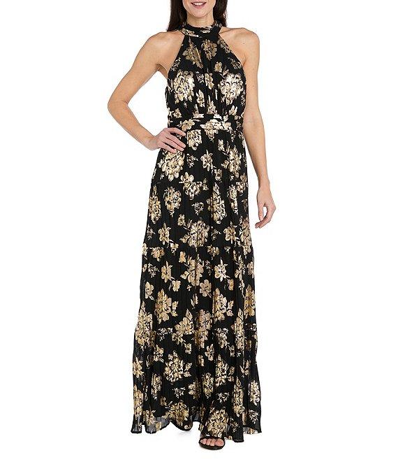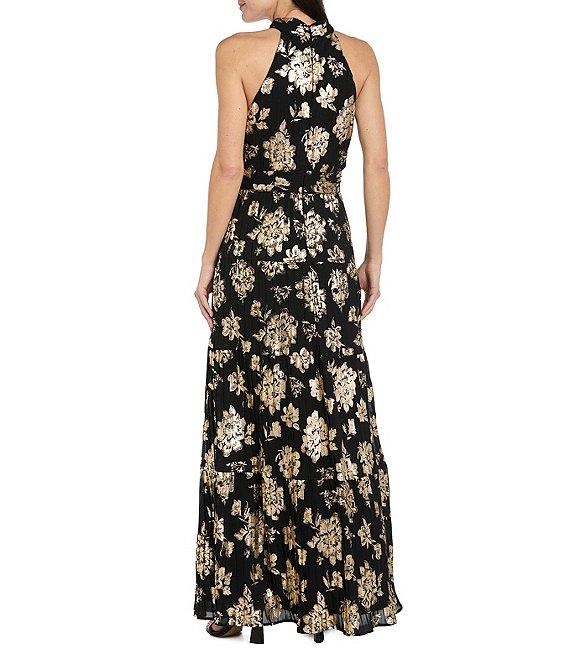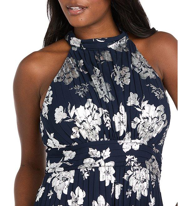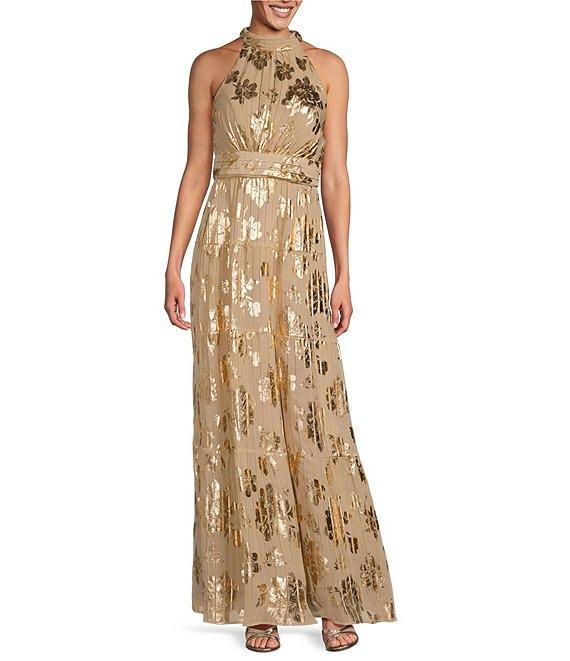 R & M Richards Halter Pleated Foil Dress