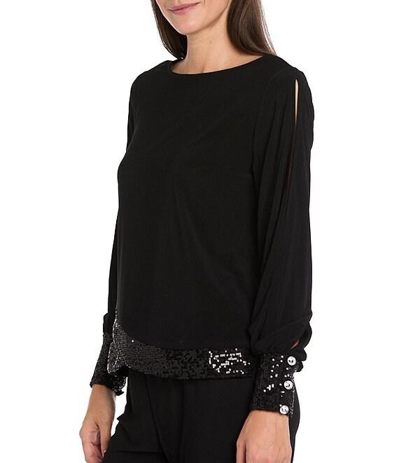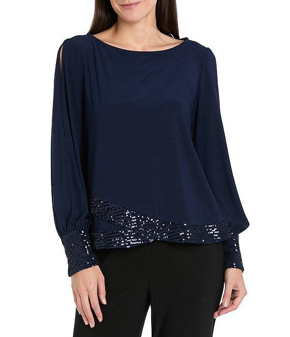 From R & M Richards, this top features: ITY and sequin mesh fabrication Round neckline Spilt long sleeves Sequin cuffs Sequin hem Lined Blouse silhouette Pullover construction Approx. 25" in length Polyester/spandex Hand wash/dry flat Imported.