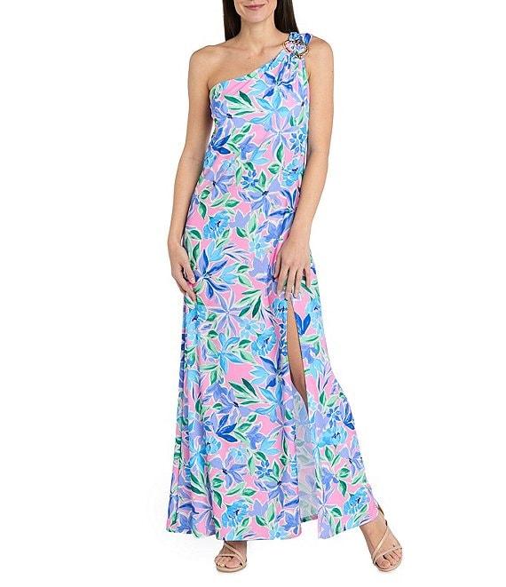 From R & M Richards, this dress features: One shoulder neckline Sleeveless Sheath silhouette Lined Floral print Pullover construction Approx. 60" in length Polyester/spandex Hand wash Imported.