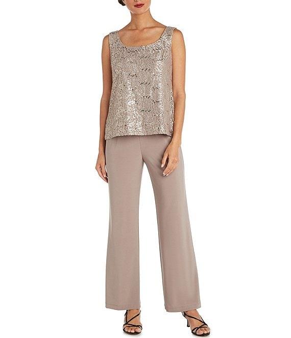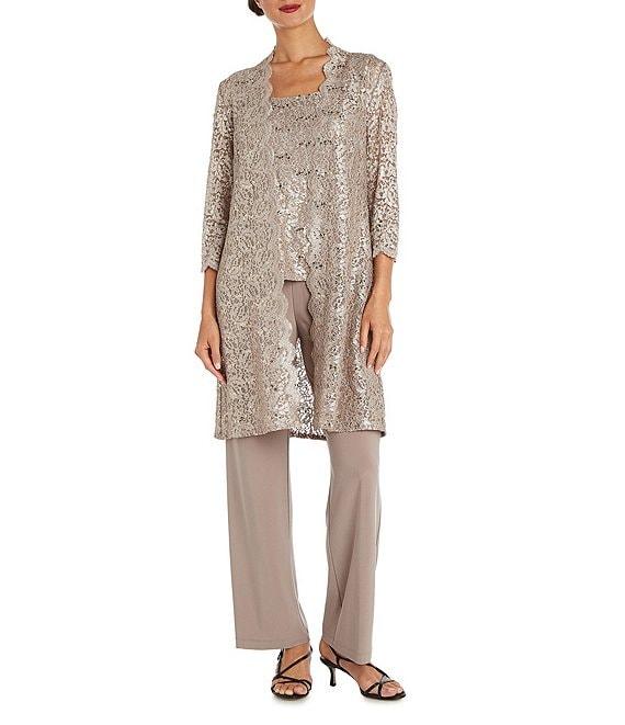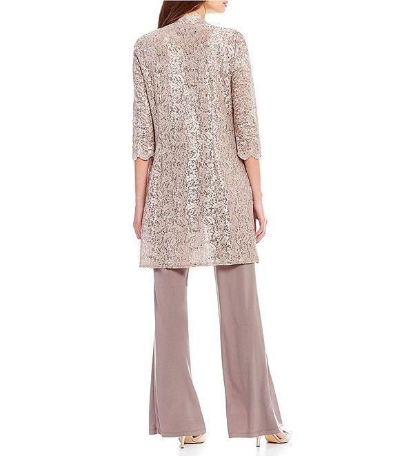 From R & M Richards Petite, this pant set features: Jacket: open front neckline 3/4 sleeves duster length glitter detail fit hits below knees open front; no closure Nylon/spandex/polyester Hand wash Shell: scoop neckline sleeveless glitter detail Pullover construction Nylon/spandex/polyester Hand wash Pant: straight leg pull-on construction Nylon/spandex/polyester hand wash Made in the USA.