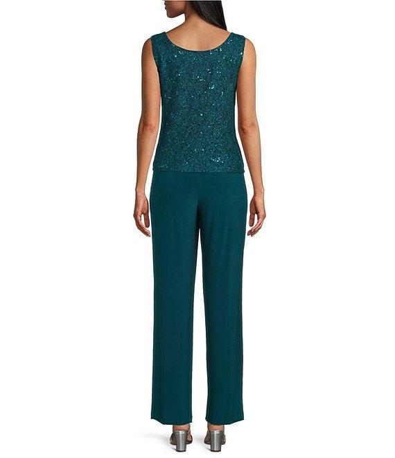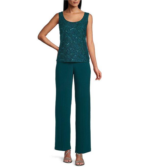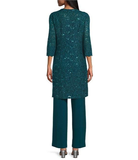 From R & M Richards Petite, this pant set features: Jacket: Lace fabrication Round neckline 3/4 sleeves Duster jacket silhouette Pearl and sequin collar detail Scallop edge jacket Sequin lace detail Approx. 36" in length Nylon/polyester/spandex Hand wash only/lay flat Top: Lace fabrication Round neckline Sleeveless Tank top silhouette Lined Pullover construction Approx. 22" in length Nylon/polyester/spandex Hand wash only/lay flat Pants: Solid ITY fabrication Flat front silhouette Lined Pull on construction Pants approx. 30" in length Nylon/polyester/spandex Hand wash/lay flat Imported.