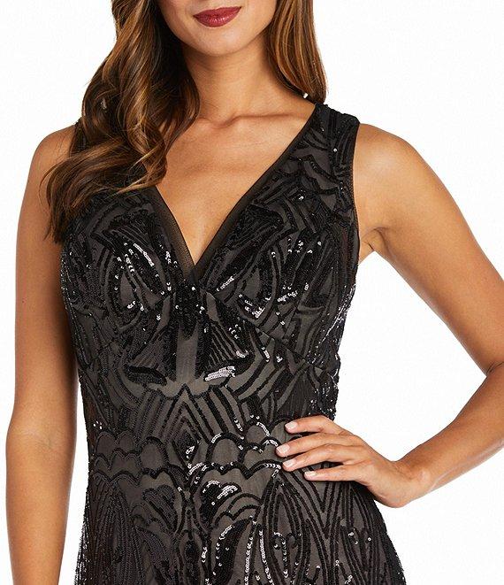 From R & M Richards, this gown features: Sequin embroidered mesh fabrication V-neckline Sleeveless Godet skirt detail Lined Zip back closure Approx. 60" length Polyester/spandex Hand wash/dry flat Imported.