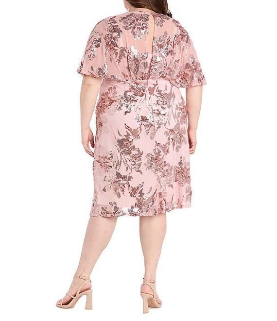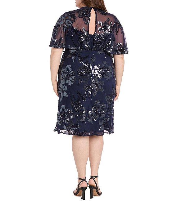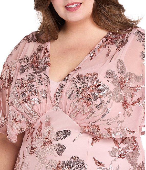 From R & M Richards Plus, this dress features: Sequin power mesh fabrication Sheath silhouette V neckline Sheer capelet sleeves Floral sequin pattern Zip back closure Approx. 41" length Polyester/spandex Hand wash Imported.