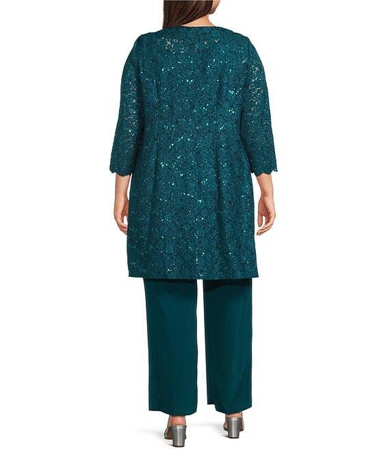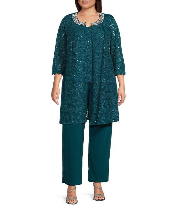 From R & M Richards Plus, this 3-piece pant set features: Jacket: Lace fabrication Round neckline Beaded pearl and sequin neckline 3/4 sleeves Lined Scalloped trim detail Front button closure Approx. 38" length Polyester/nylon/spandex Hand wash Tank: Lace fabrication Round neckline Sleeveless Lined Pullover construction Approx. 27" length Polyester/nylon/spandex Hand wash Pants: Solid ITY fabrication Flat front silhouette Straight leg Pull on construction Approx. 32" inseam Polyester Hand wash Imported.
