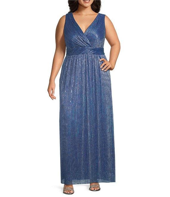 From R & M Richards Plus, this 2-piece set features: Jacket: Matte jersey chiffon fabrication Open front; no closure 3/4 sleeves Polyester Approx. 32" in length Hand wash only/lay flat Dress: Pleat crinkle fabrication Hologram detail Metallic V-neckline Lined Center back zipper Approx. 61" in length Polyester/metallic Hand wash only/lay flat Imported.