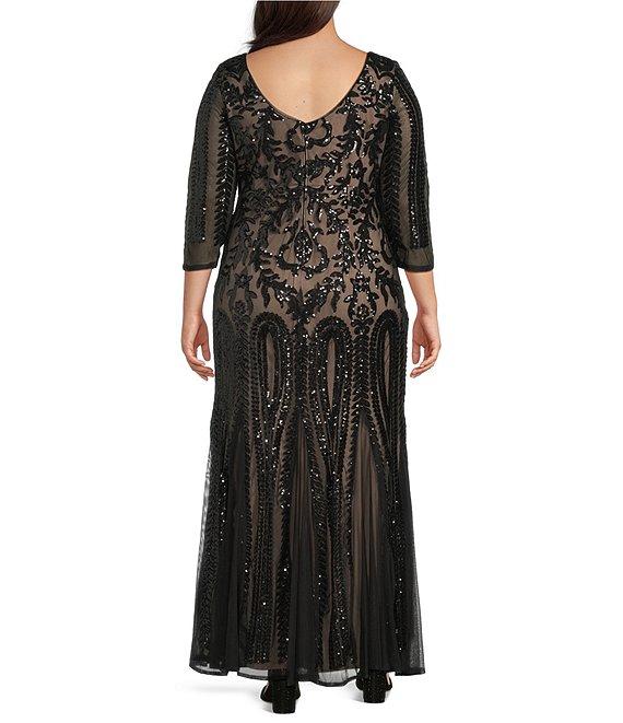 From R & M Richards, this dress features: Embroidered sequin power mesh fabrication V-neckline 3/4 sleeves Contrast lining Beaded detail Godet skirt Center back zipper closure Approx. 61" in length Polyester/spandex Hand wash/dry flat Imported.