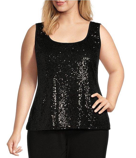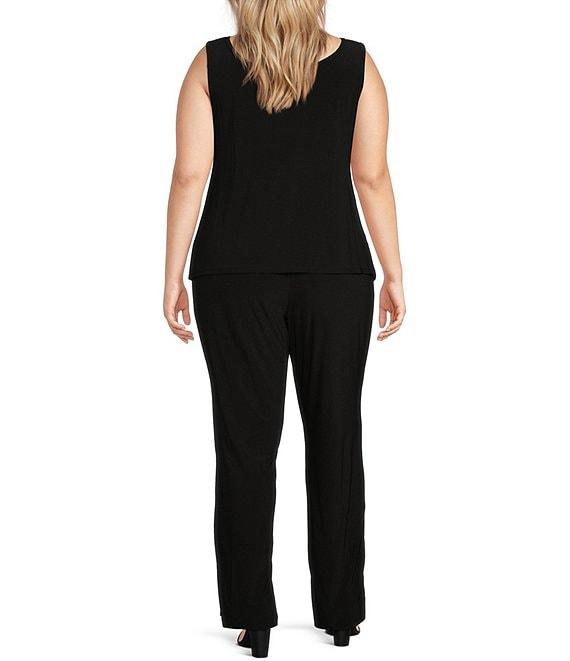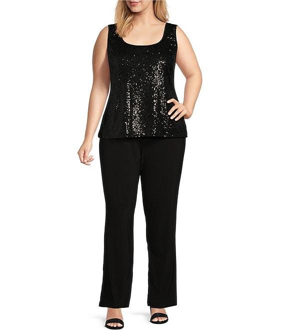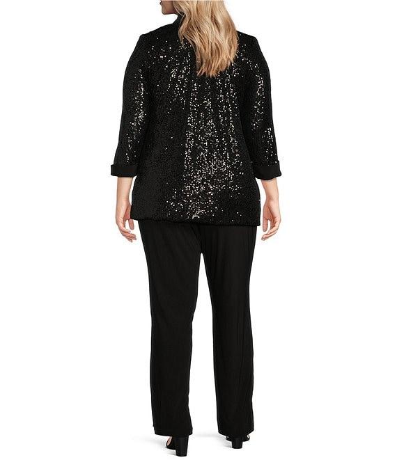 From R & M Richards Plus, this 3-piece pant suit features: Tank: Sequin jersey fabrication Scoop neckline Sleeveless Attached necklace Lined Straight hemline Pullover construction Approx. 27'' length Polyester/spandex Hand wash/dry flat Jacket: Sequin jersey fabrication Open neckline 3/4 sleeves Straight hemline Satin lapels Cuffs Button closure Approx. 31'' length Polyester/spandex Hand wash/dry flat Pants: Flat front silhouette Mid-rise elastic waist Straight hemline Pull-on construction Approx. 32'' inseam Polyester Hand wash/dry flat Imported.
