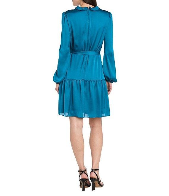 From R&M Richards, this dress features: Silky touch satin fabrication Ruffle v-neckline Long balloon sleeve Self tie belt Lined Center back zipper closure Approx. 39" in length Polyester Hand wash/dry flat Imported.