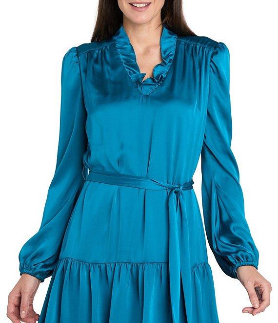 R & M Richards Silky Satin Charmeuse Ruffle V-Neck Long Sleeve Belted Dress
