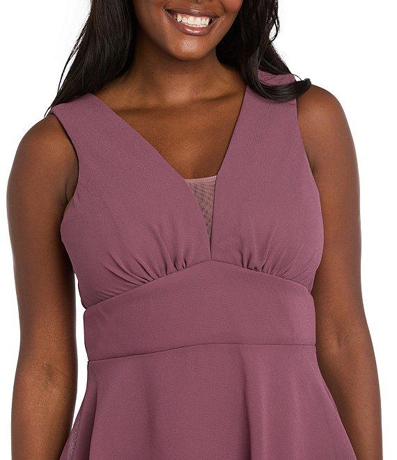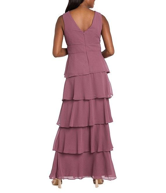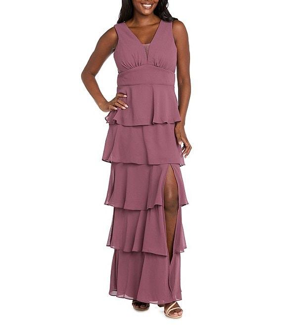 From R & M Richards, this dress features: Pebble georgette and solid tulle fabricationV-necklineSleevelessGown silhouetteLinedTiered skirtSet in waist bandV backFront slitCenter back zipper closureApprox. 59" lengthPolyesterHand washImported.