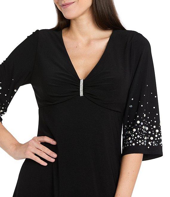 R & M Richards Solid ITY V-Neck Rhinestone Pearl Elbow Sleeve Fit And Flare Dress