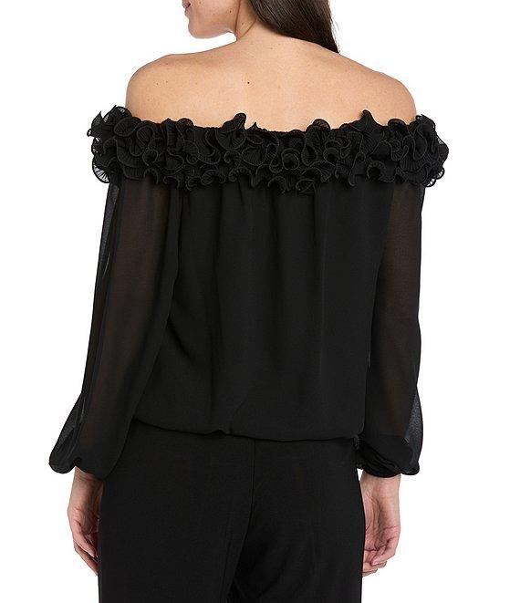 R & M Richards Souffle Crepe Chiffon Ruffle Trim Off The Shoulder Long Sleeve Blouson Top