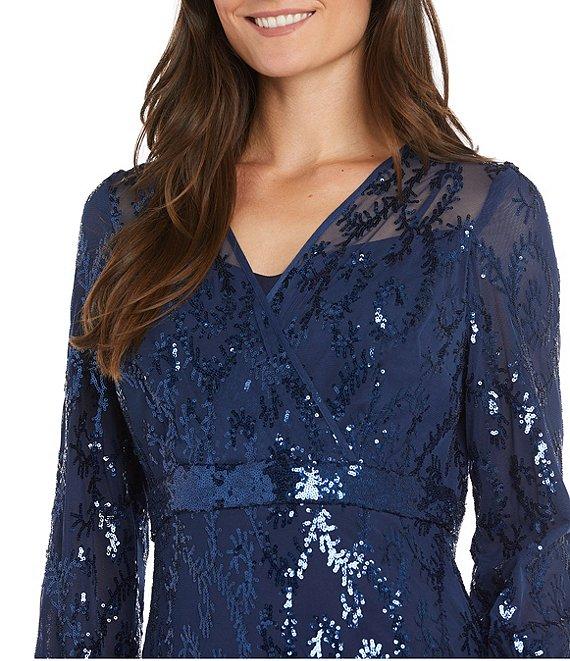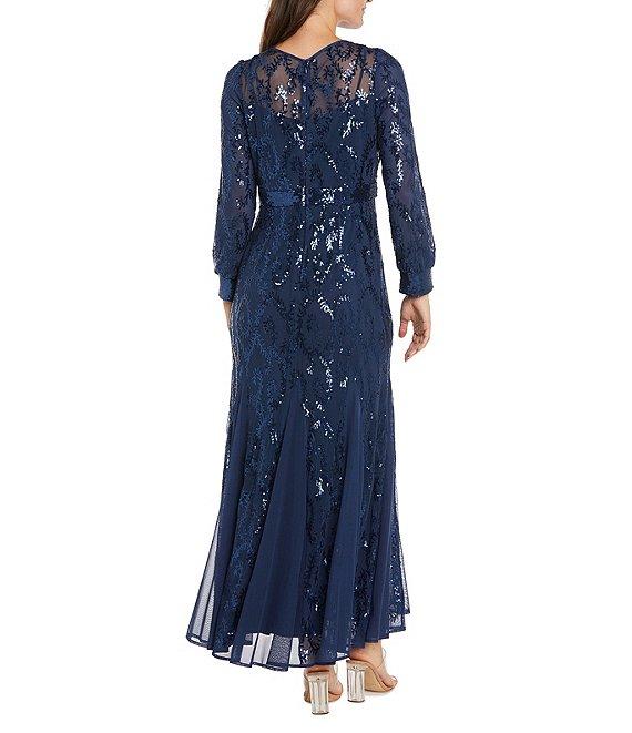 R & M Richards V-Neck Long Sleeve Embroidered Sequin Mesh Gown