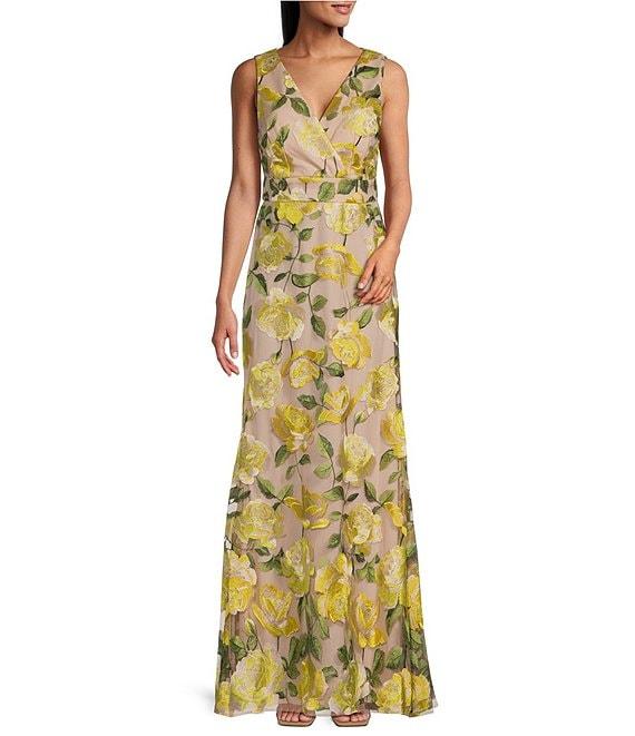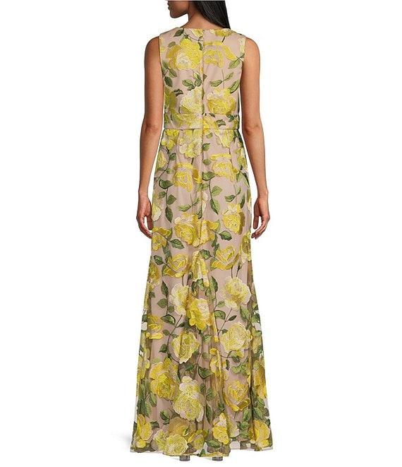 From R & M Richards, this dress features: Embroidered mesh fabrication V-neckline Sleeveless Mermaid silhouette Floral details Zip back closure Approx. 61" in length Polyester Hand wash Imported.
