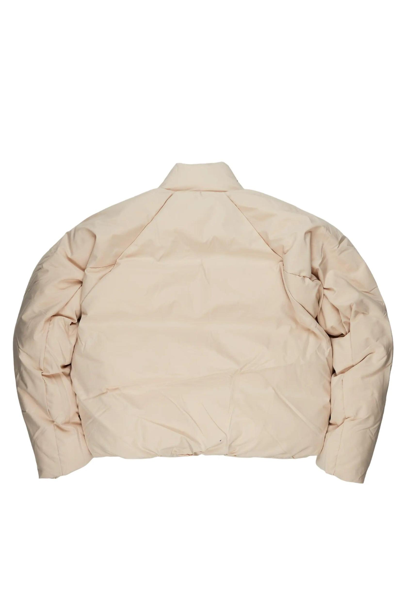 An urban streetwear puffer jacket for men in beige. Designed with highest-quality insulated fabric and water and wind-resistant materials for a must-cop outerwear style. Mock neckline Slant zip pockets Hidden phone pocket Adjustable bungee cords Water-resistant outer shell Elastic cuffs Embroidered RSO logo Custom paint splatter
