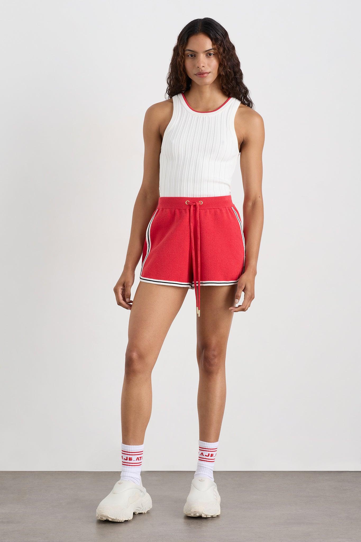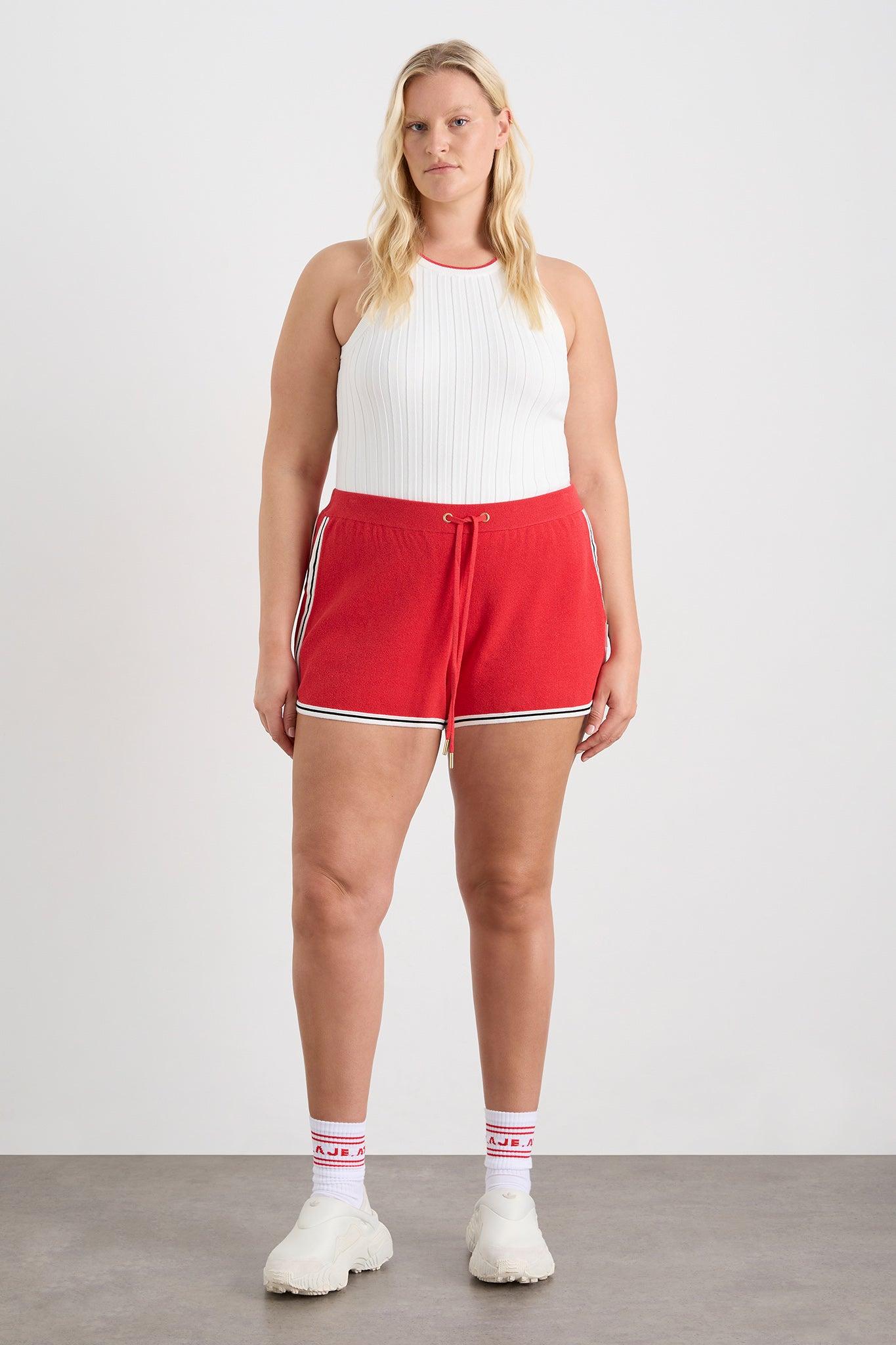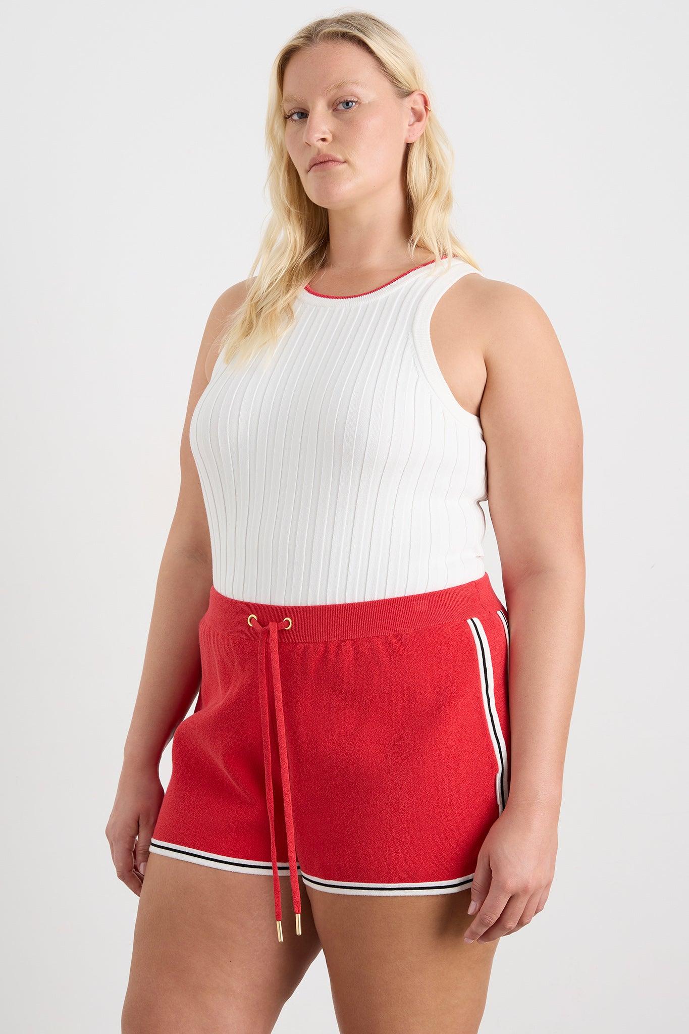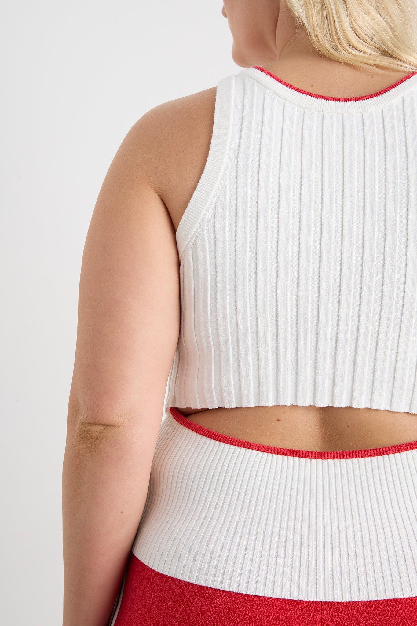 PRODUCT DETAILS Rib knit tank top Slim fit Racer neckline Contrast neck and back trim Back waist cut out with contrast trim SIZE AND FIT Mileshka wears a size 8/S and is 176cm/5'9 height Yaz wears a size 12/L and is 173cm/5'7 in height Sarah wears a size 16/XXL and is 183cm/6'0 in height FABRICATION 52% Viscose 38% Cotton 10% Elastane