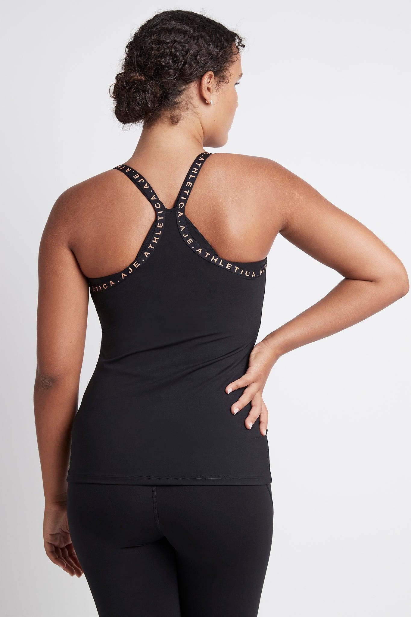 PRODUCT DETAILS Slim fit through the body Racerback design Contrast AJE ATHLETICA logotape wraps around straps and armhole Lightweight, breathable fabric SIZE AND FIT Frankie wears a size 8/S and is 178cm in height Aroha wears a size 12/L and is 176cm in height Yasmine wears a size 16/XXL and is 175cm in height FABRICATION 70% Recycled Nylon 30% Elastane Delicate Cold Hand or Machine Wash