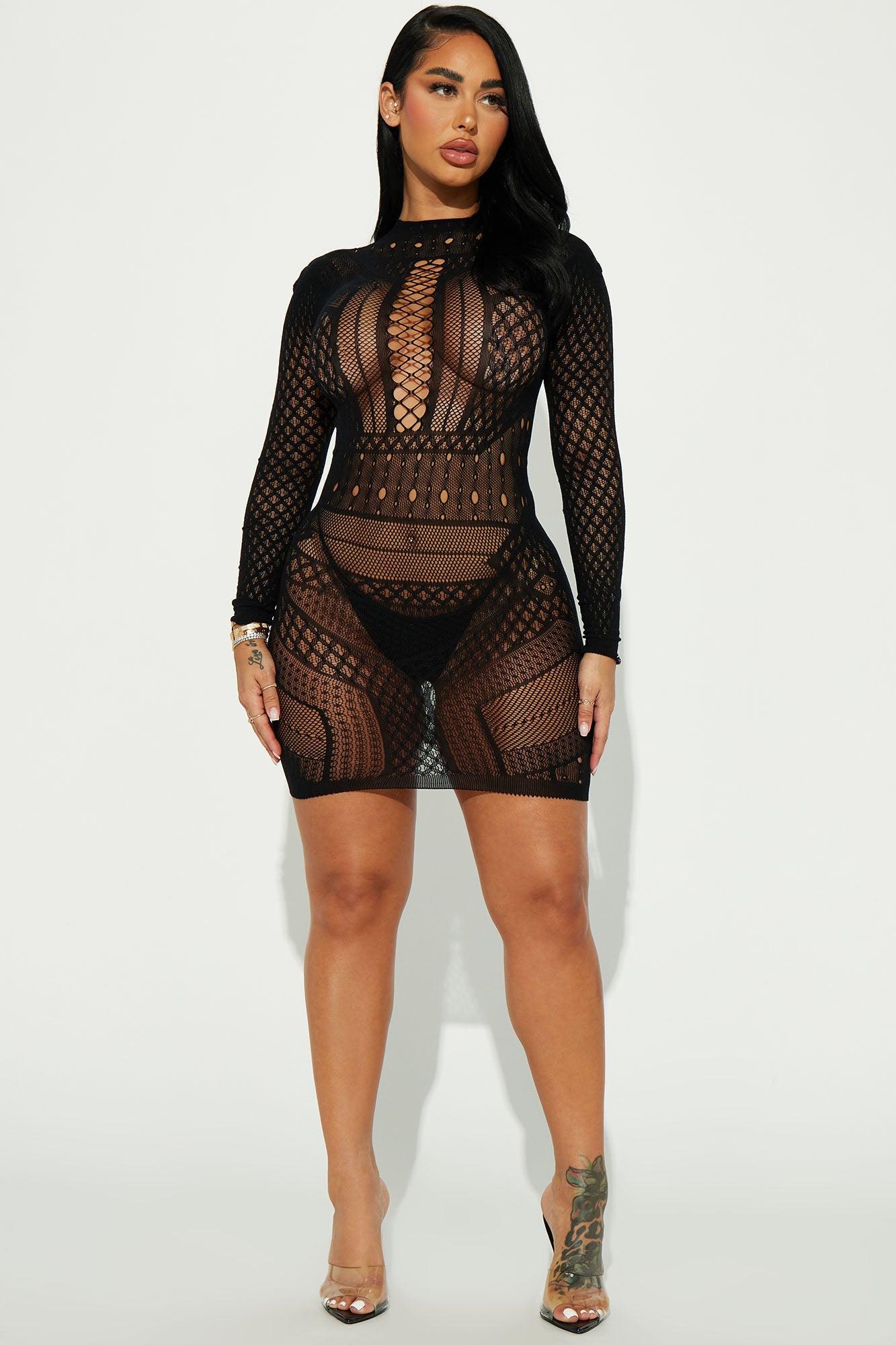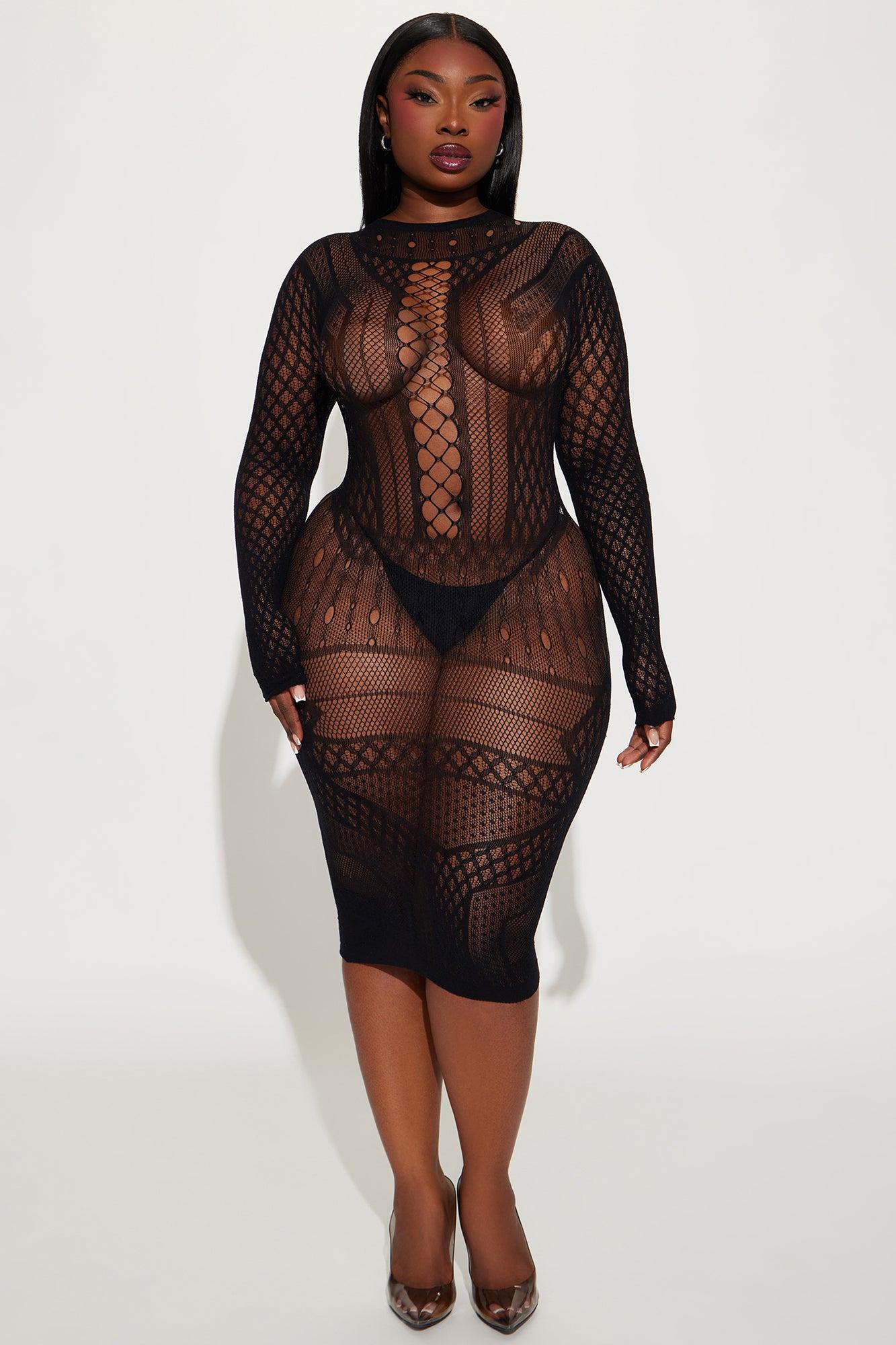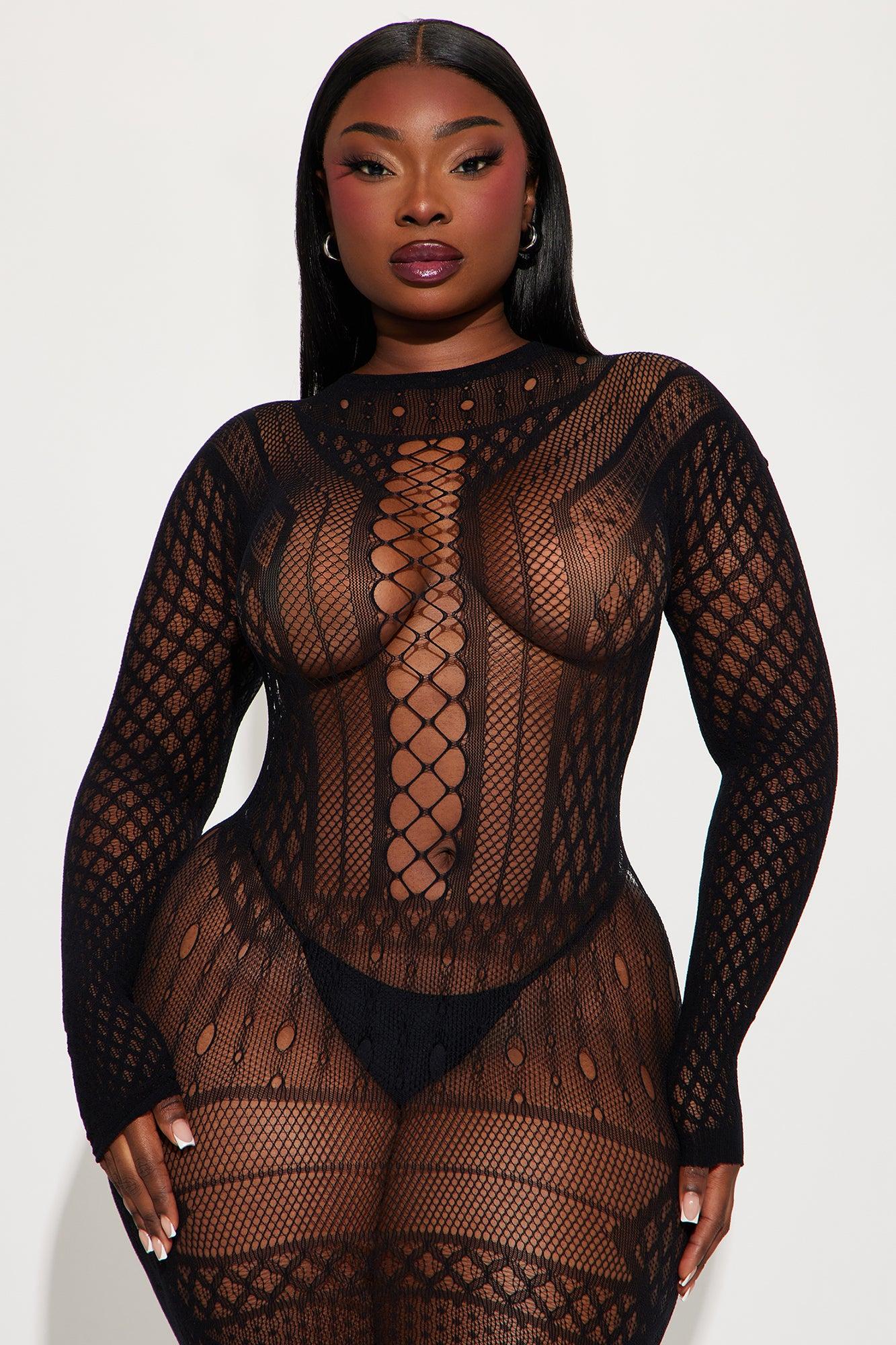 Available In Black. Bodystocking Chemise High Neck Long Sleeve Criss-Cross Panel Geometric Design Thong Not Included Full Stretch Final Sale 92% Nylon 8% Spandex Imported