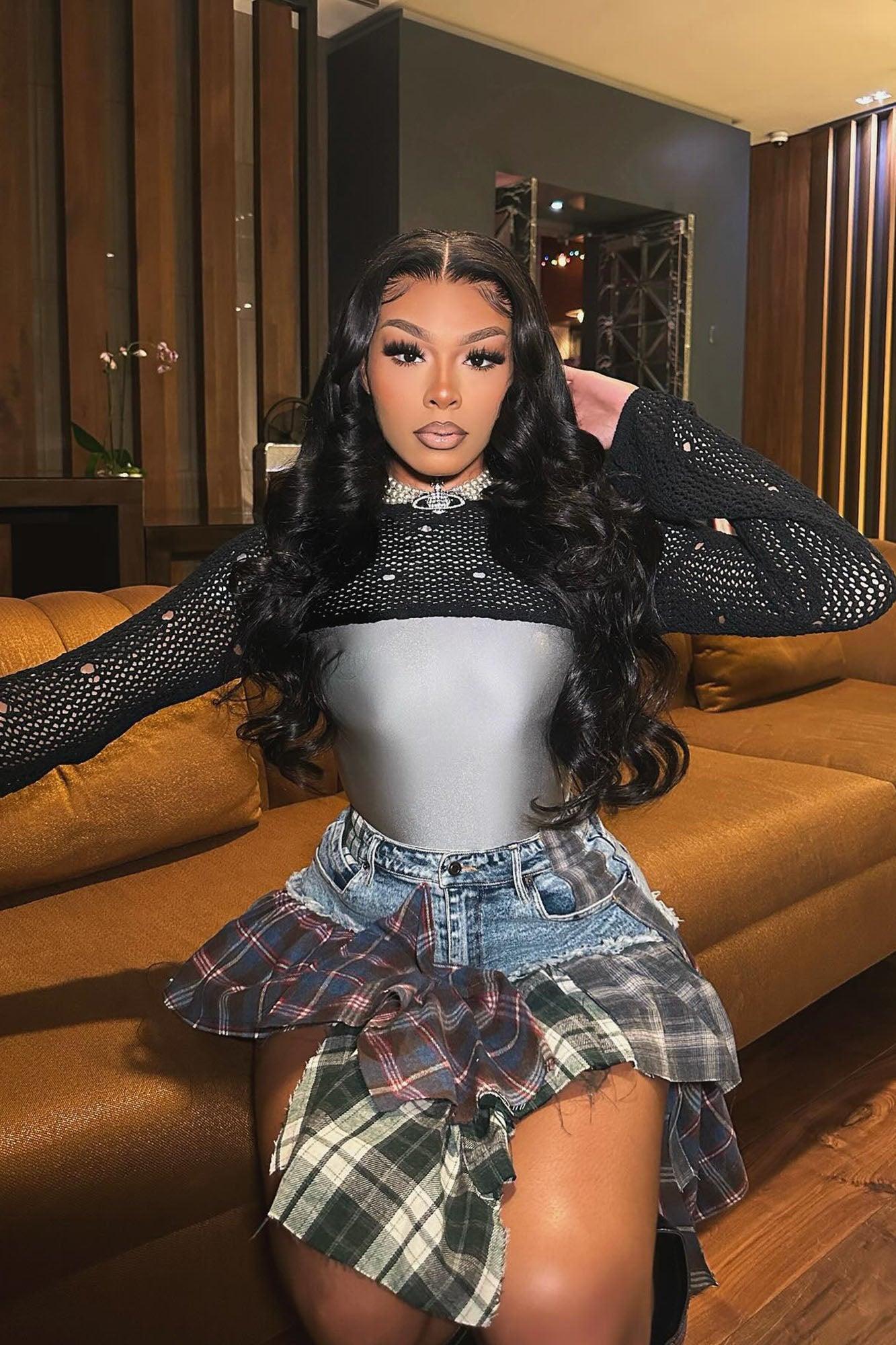 Available In Medium Wash. Mini Skirt Colorblock Plaid Denim Contrast High Rise Button Zipper Closure Frayed Hem Non Stretch Disclaimer: Due To The Specialized Wash & Distressing Process, Each Garment Is Unique 99% Cotton 1% Spandex Imported California Proposition 65WARNING: Cancer and Reproductive Harm - www.P65Warnings.ca.gov.