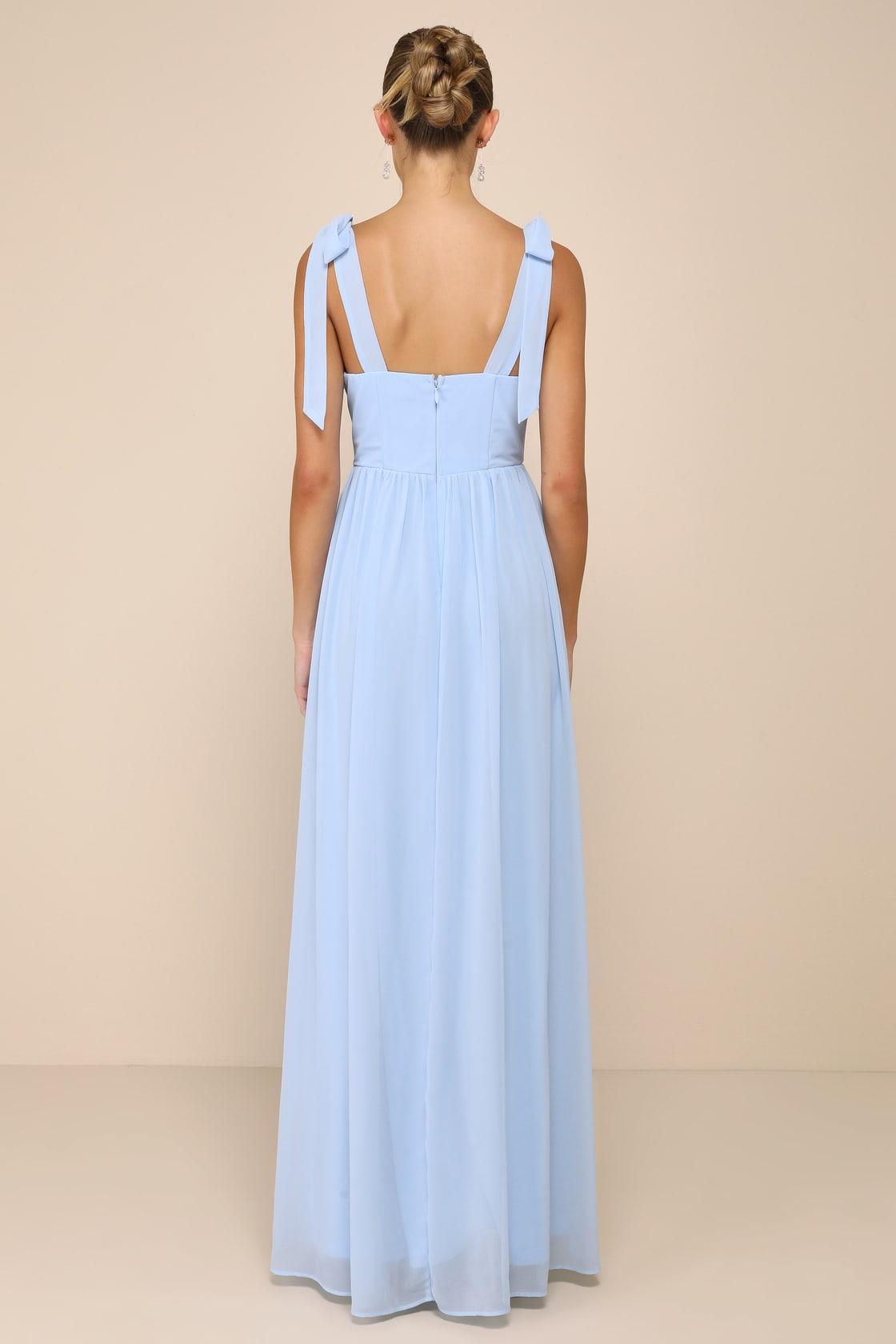 You'll be the toast of every event when you arrive dressed to impress in the Lulus Radiant Charisma Light Blue Chiffon Ruched Tie-Strap Maxi Dress! Airy woven chiffon shapes this gorgeous dress that has tying shoulder straps and a fitted bodice with hidden side boning, a sweetheart neckline, and a flattering ruched detail at the center. Fitted waist tops a gathered skirt that falls to a dramatic maxi hem with a sultry, thigh-high side slit. Hidden zipper/clasp at back.