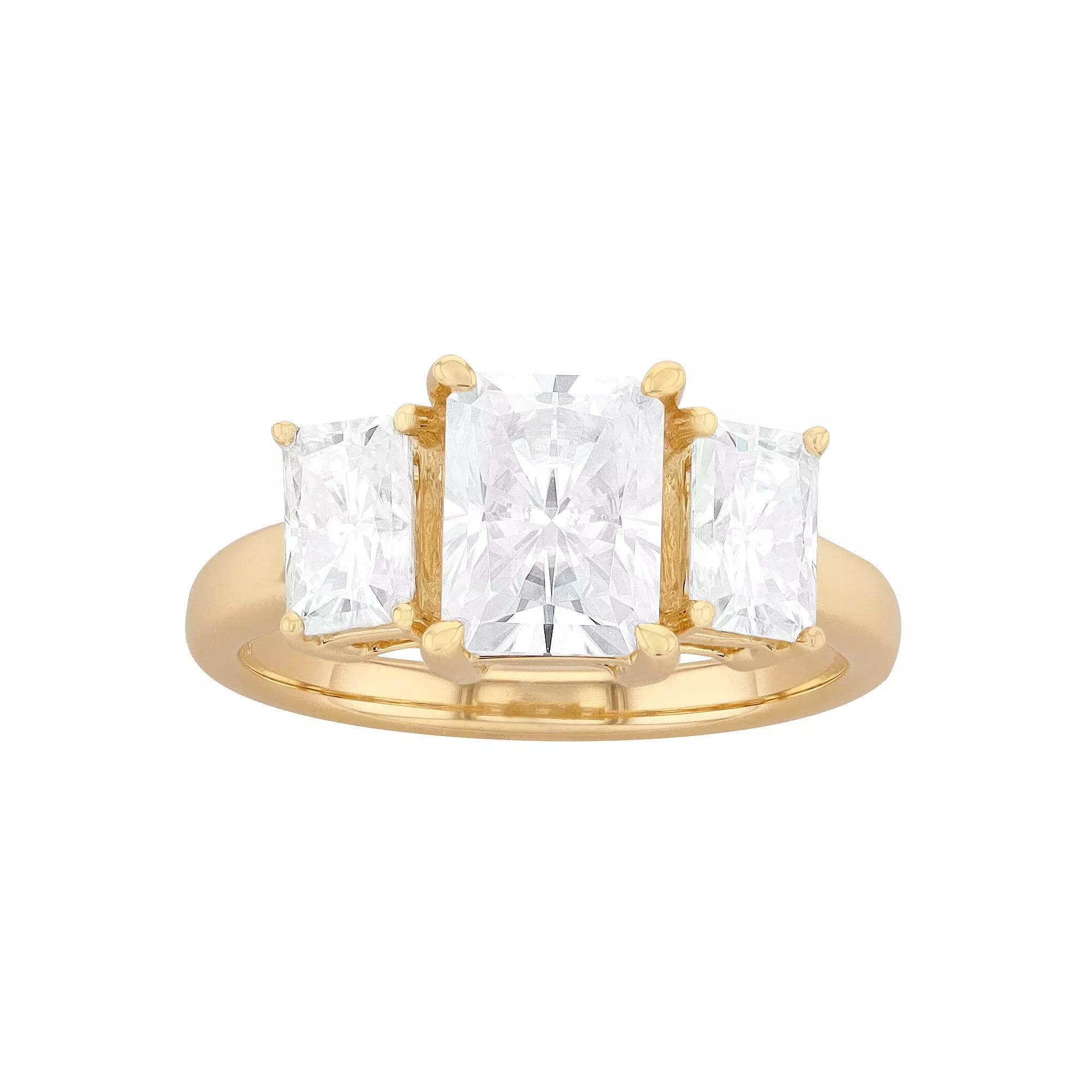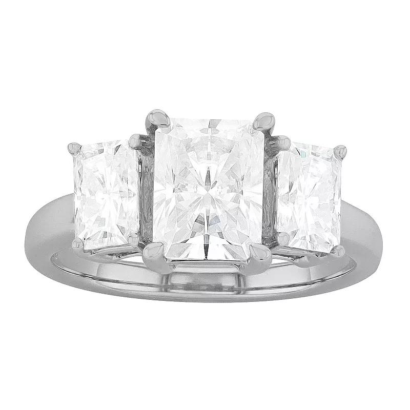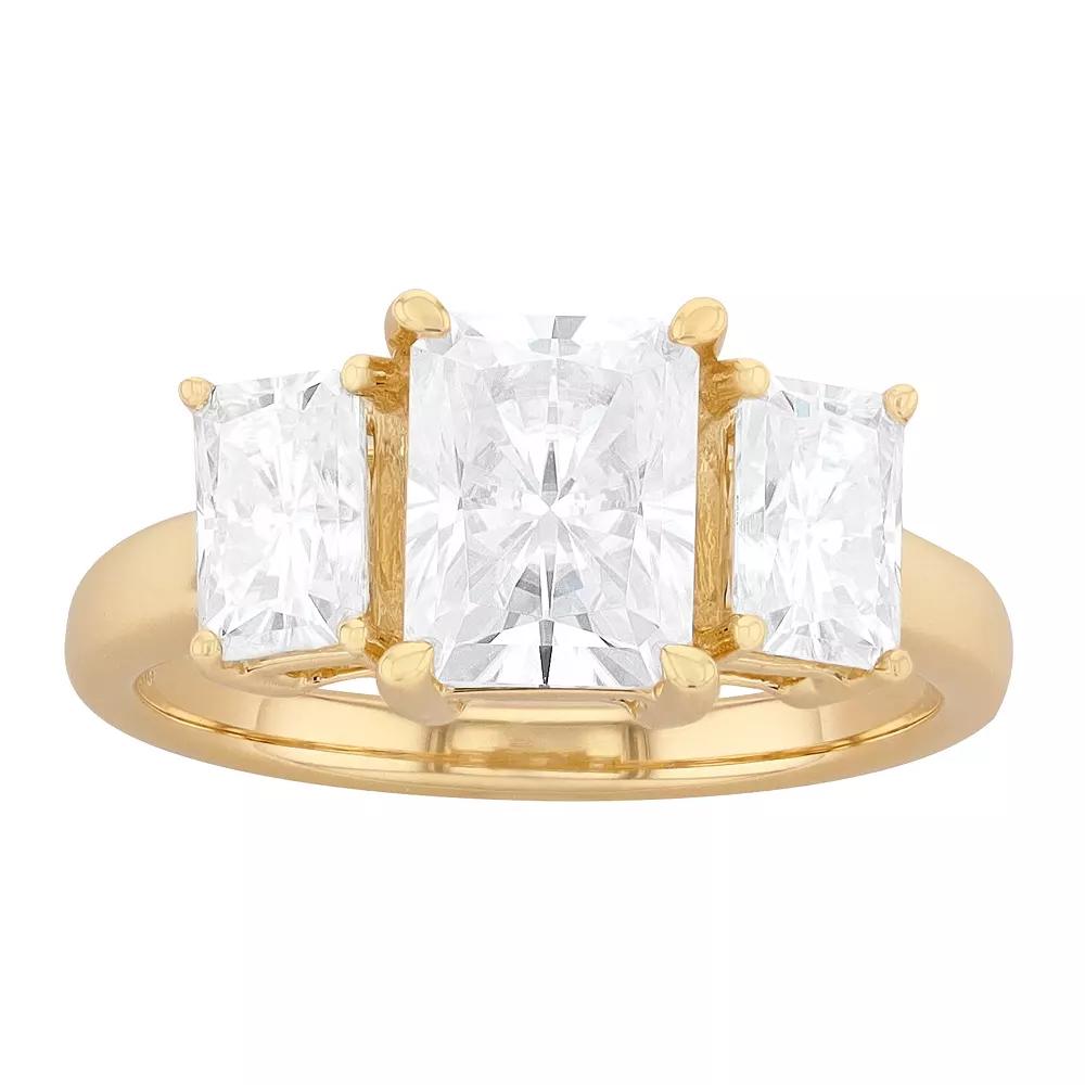Adorned with rectangular-cut, lab-created moissanite stones arranged in a three-stone motif, this 14k gold Radiant Fire engagement ring is truly stunning. Adorned with rectangular-cut, lab-created moissanite stones arranged in a three-stone motif, this 14k gold Radiant Fire engagement ring is truly stunning. Width: 14.8 mm Metal: 14k gold Finish: polished Packaging: boxedSTONE DETAILS Stone type: lab-created moissanite Total weight: 2 7/8 ct. Center stone weight: 1 5/8 ct. Center stone size: 8 mm x 6 mm Shape: rectangle Setting: prong Gemstones may have been treated to enhance their appearance. Special care may be required. Please visit our Gemstone Treatment & Special Care Guide for more information. Diamond equivalent carat (ct.) Total Weight (T.W.) represents the approximate total weight of diamonds of equivalent appearance. Image(s) may be enlarged to show detail. Please note, due to the high value of this item, a signature may be required upon delivery. Color: White. Gender: female. Age Group: adult.