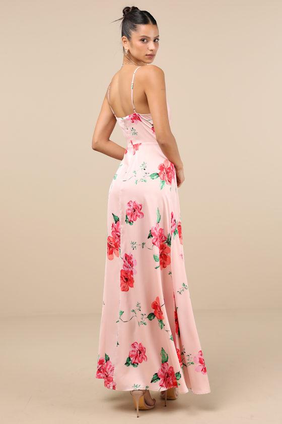 A glass of bubbly and the Lulus Radiant Occasion Light Pink Floral Satin A-Line Maxi Dress makes the perfect pair! A darling floral print dances across sleek woven satin, shaping slender spaghetti straps and a surplice bodice with pleated details. Fitted waist tops an A-line skirt that ends at a maxi hem with a thigh-high side slit. Hidden zipper/clasp at back.