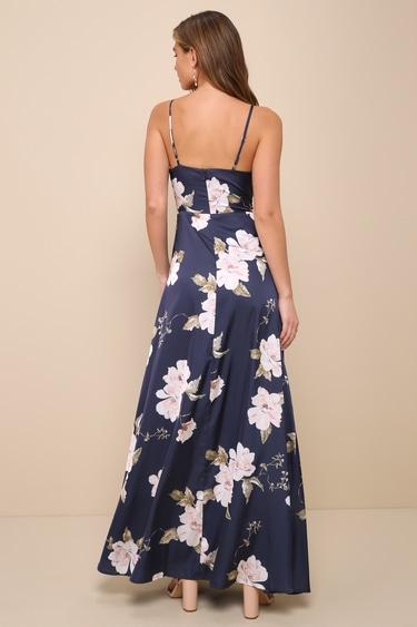 A glass of bubbly and the Lulus Radiant Occasion Navy Blue Floral Satin A-Line Maxi Dress makes the perfect pair! A delicate floral print dances across sleek woven satin, shaping slender spaghetti straps and a surplice bodice with pleated details. Fitted waist tops an A-line skirt that ends at a maxi hem with a thigh-high side slit. Hidden zipper/clasp at back.