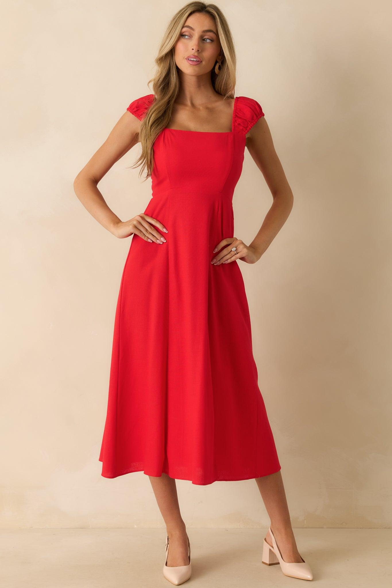 Be the life of the party in our Radiant Reverie Red Midi Dress! This stunning dress features a vibrant red color, perfect for making a statement. The midi length and flowy silhouette offer both style and comfort, making it ideal for any occasion. Embrace your playful side and radiate confidence in this dress! This red midi dress features a square neckline, a smocked section in the back, a hidden zipper in the back, smocked sleeves, a slit up the leg, and a flowy skirt.
