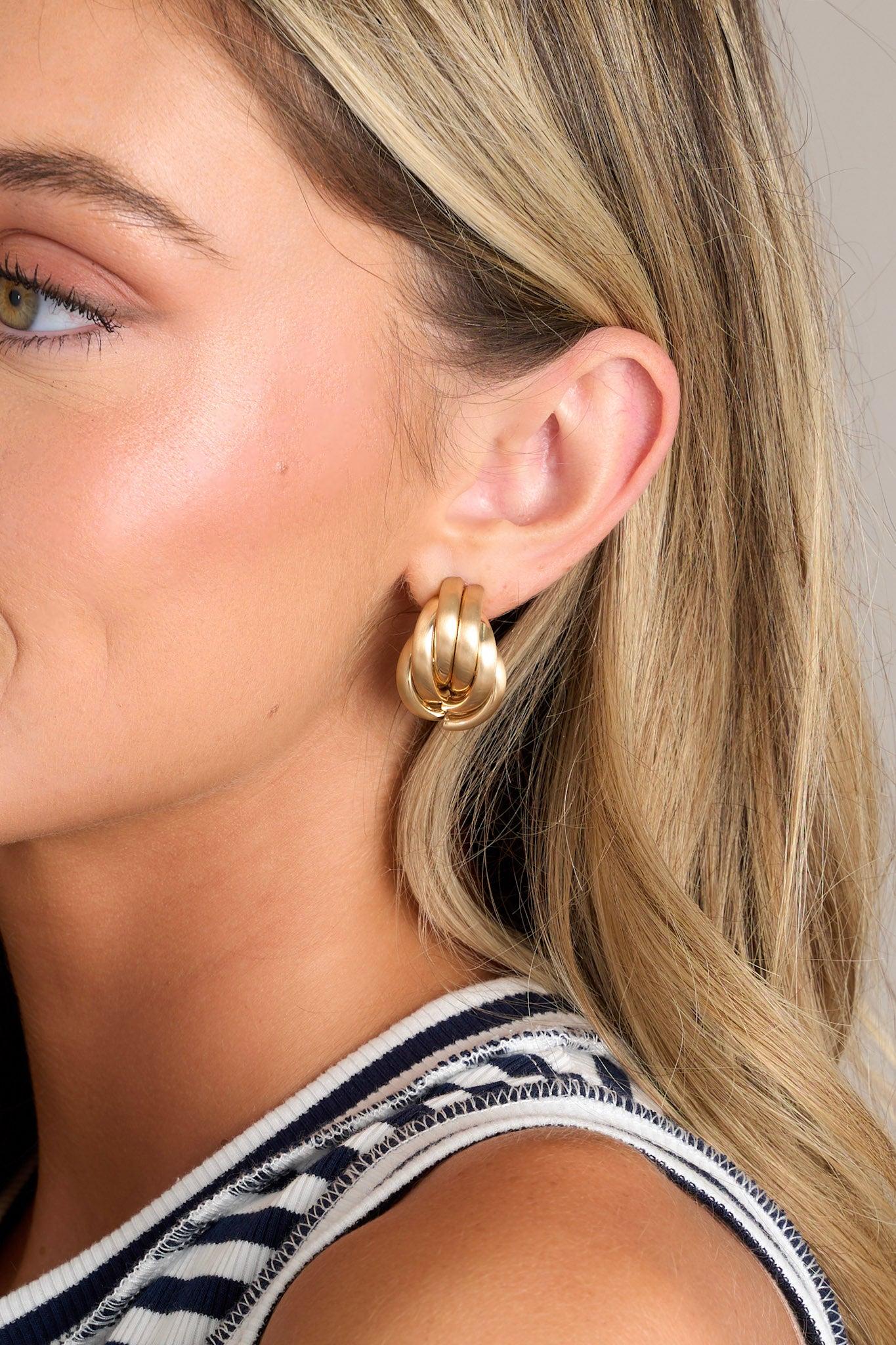Get ready to shine with these Radiant Ring Matte Gold Earrings! These earrings will add a touch of elegance to any outfit, making you stand out from the crowd. With their unique matte gold finish, these earrings will surely catch the eye of anyone who sees them. Elevate your look with these stunning earrings! These gold earrings feature a unique gold hoop design, a matte gold finish, and secure post backing. Earrings measure 1.5" Long Imported