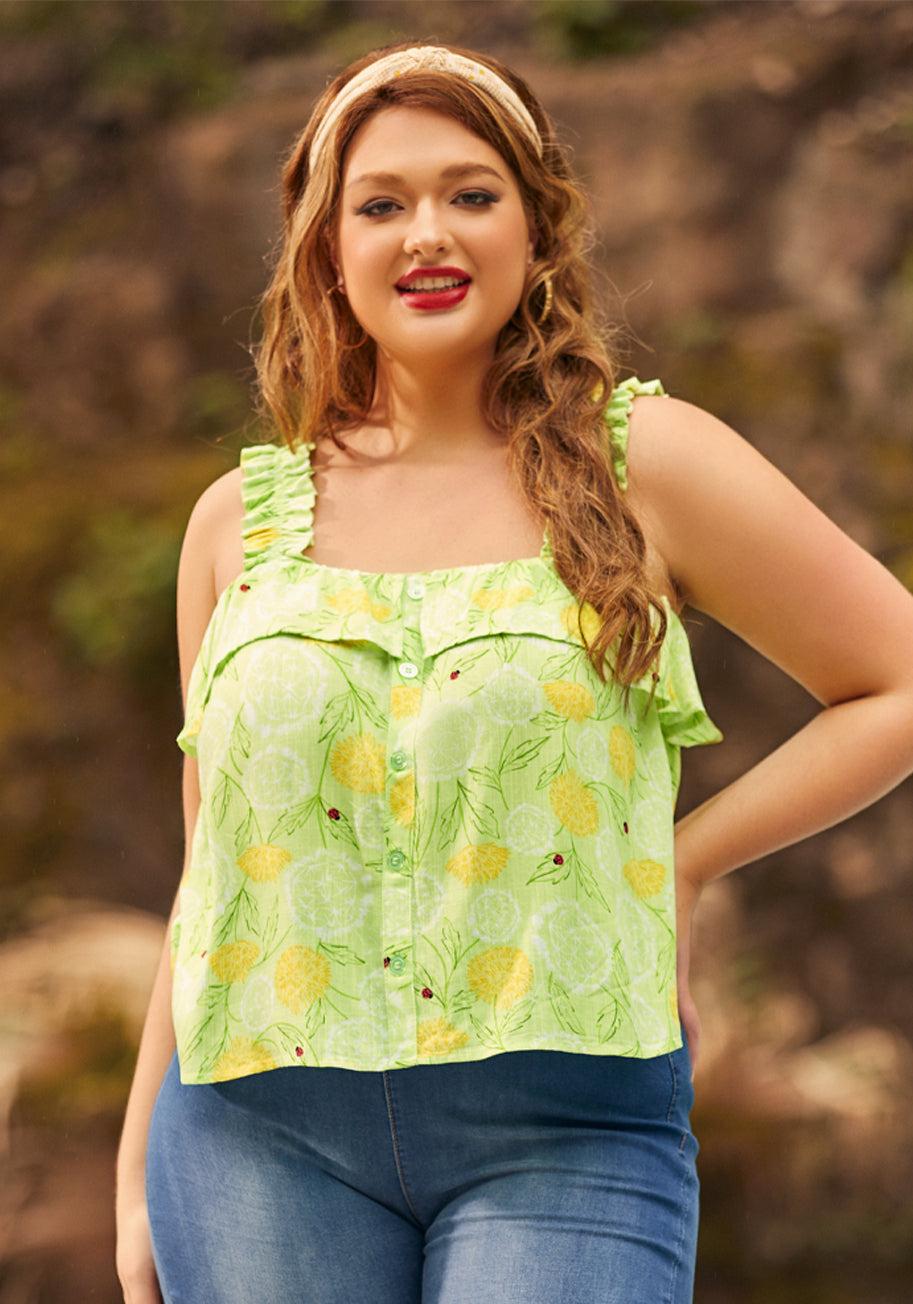 From our ModCloth namesake label, this light green, lemon-adorned blouse is a refreshing twist on warm-weather style. Ruffle wide spaghetti straps flutter gracefully, adding an air of whimsy, while the button-down front keeps things neat. Whether it's a day at the office that could use a dash of cheer or a weekend brunch date, this blouse is your go-to for a zest of life. Pair with light trousers for a look that's as refreshing as a tall glass of lemonade. 100% Rayon Machine wash cold, line dry Imported Model 1 is wearing a US size S Model Measurements: Height 5'7"/ Bust 33''/ Waist 24''/ Hips 35''