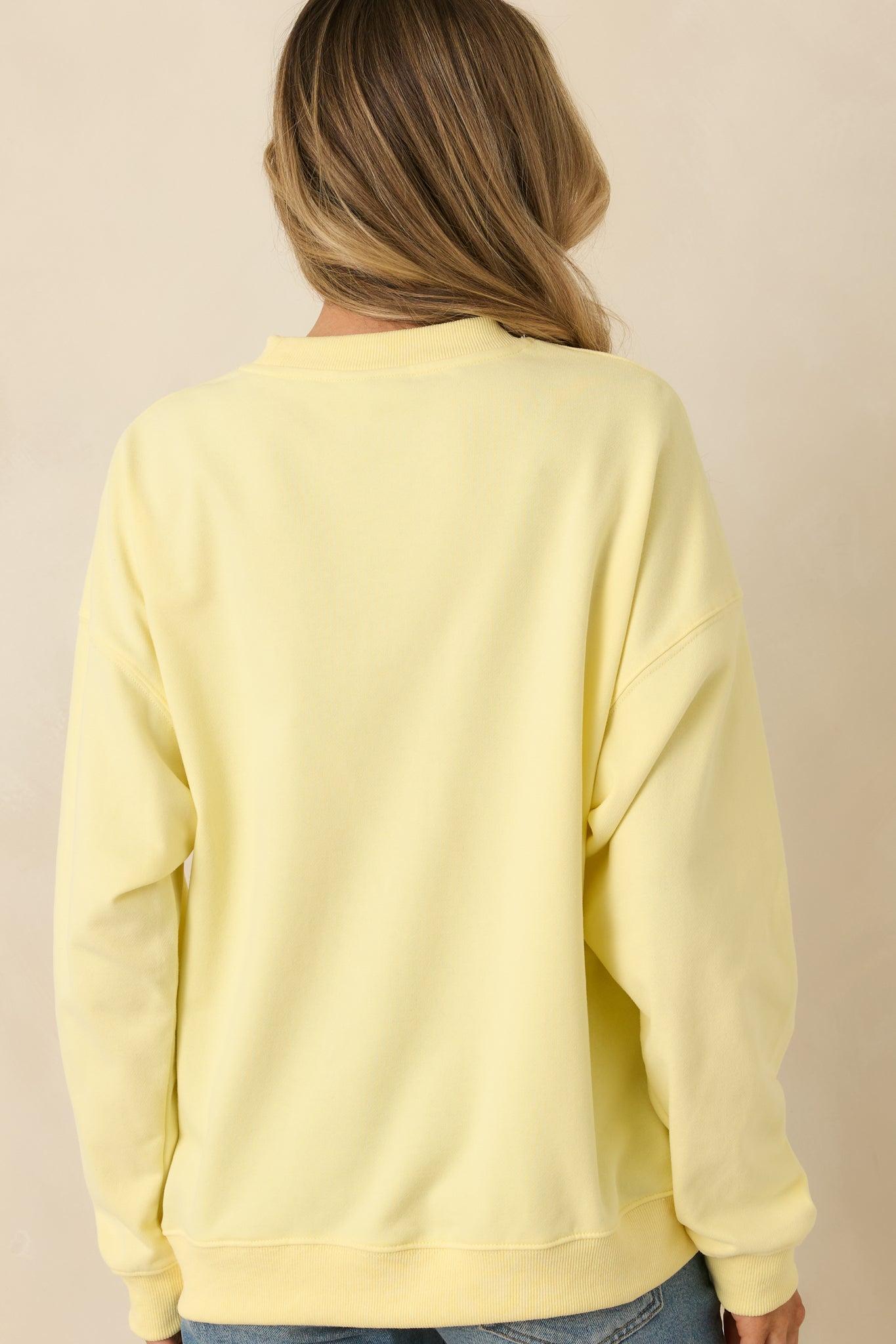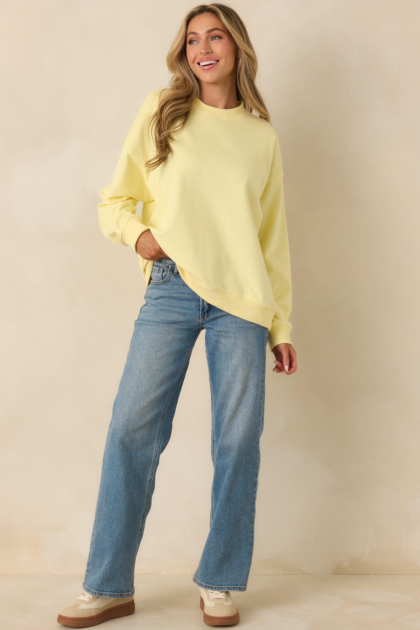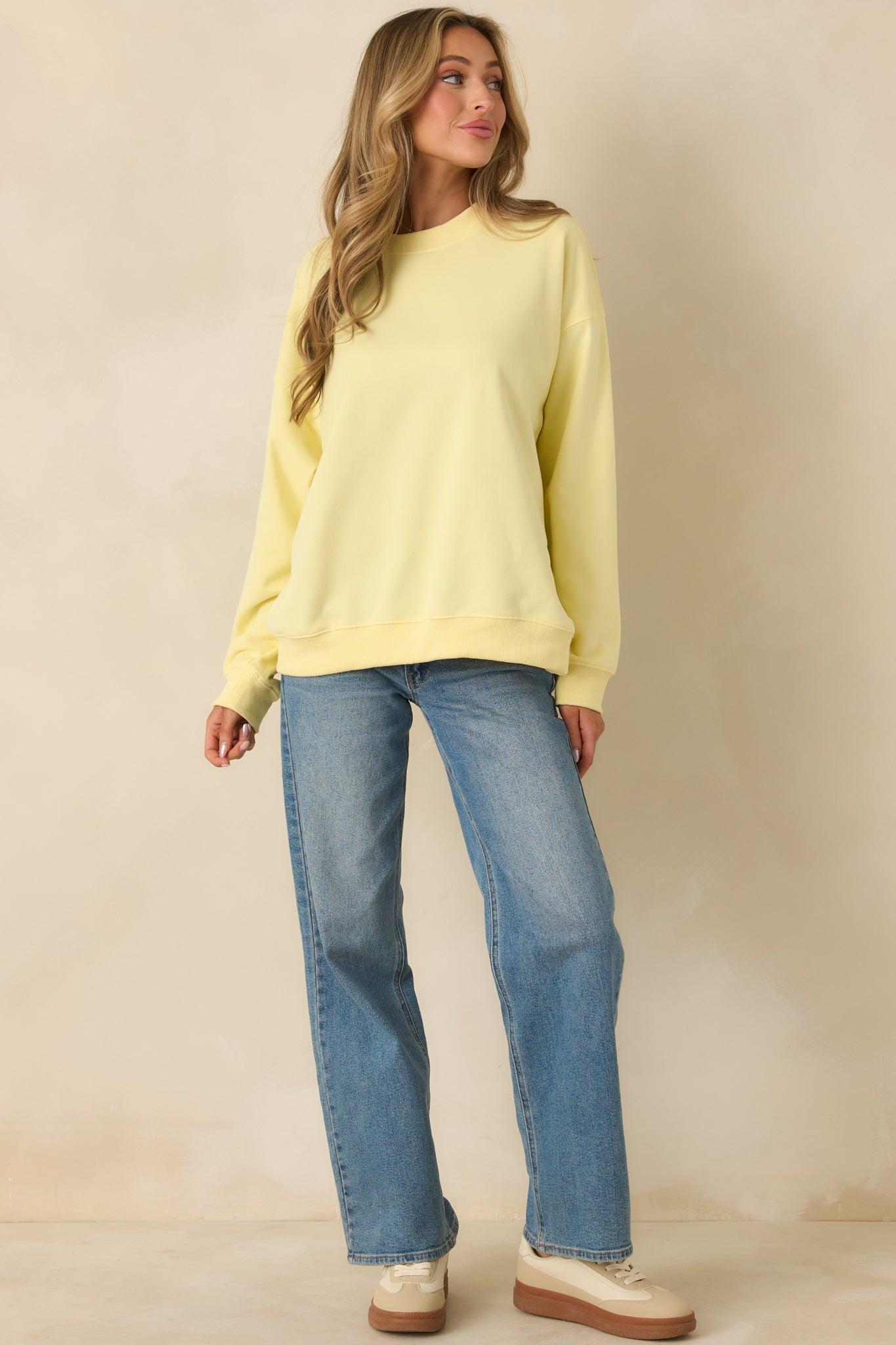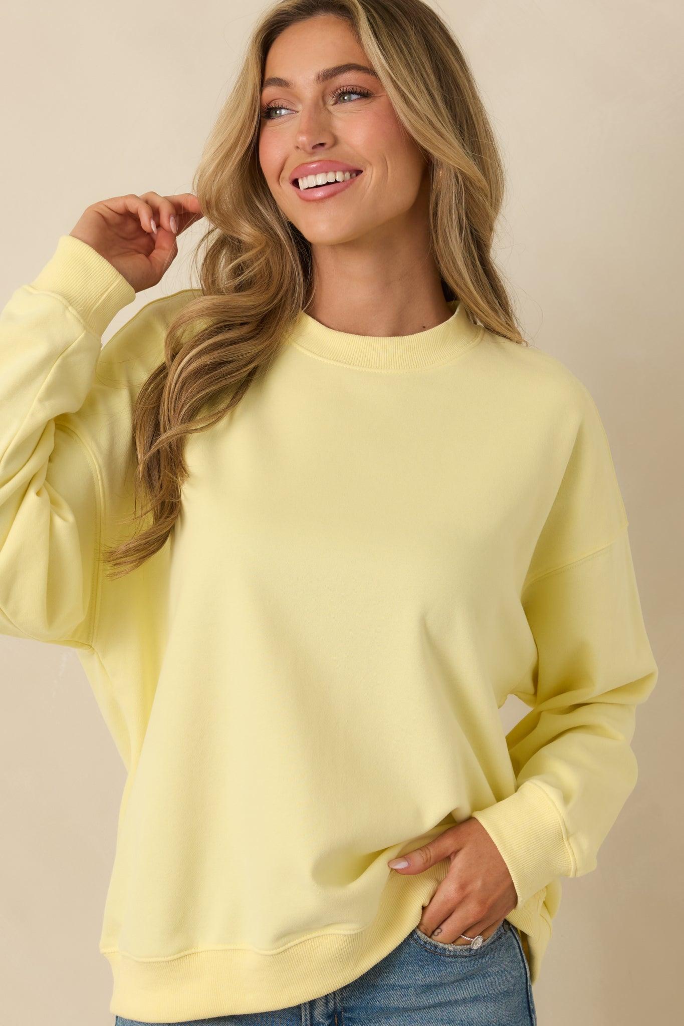 The Radiant Vibes Yellow Crewneck Sweatshirt is exactly what it sounds like. This bright yellow crewneck brings an instant mood boost with a relaxed, easy fit that feels just right for everyday wear. It’s the kind of sweatshirt that makes even low-key days feel a little sunnier. This yellow crewneck sweatshirt features a soft knit fabric with a classic crew neckline, long sleeves, and ribbed trim at the cuffs and hem. Designed with a relaxed fit for comfortable wear and easy layering.81% Cotton & 19% PolyesterUnlinedHand Wash ColdManufactured in ChinaDesigned in the USAModel is 5'8" and wearing size small