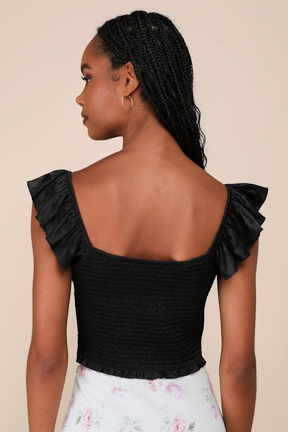 Lend a sweet yet sophisticated finish to your look with the Lulus Radiating Elegance Black Crinkle Satin Flutter Sleeve Top! Crinkly woven satin shapes short flutter sleeves with elastic at the shoulders. Ruffled trim accents the subtle sweetheart neckline, which has a pink satin ribbon that ties above a keyhole cutout. Seamed bust lends a bustier-inspired effect, atop a rounded cropped hem. Smocking at back for fit.