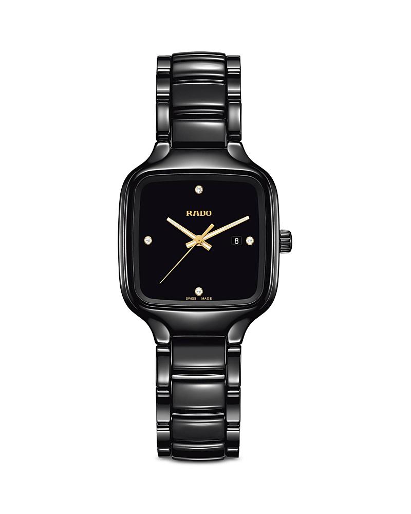 An updated version of an iconic RADO watch is the brands first made with a square injected monoblock high-tech ceramic case thats light and scratch-resistant. The dial is set with four sparkling diamonds that accentuate the timepieces modern, minimalist appeal. 29mm case; 8.1mm case depth Adjustable bracelet; links can be removed at your local Nordstrom. Deployant clasp closure Total diamond weight: 0.032ct. Swiss quartz movement Sapphire crystal face Ceramic/stainless steel/diamond Swiss made Diamond Guide