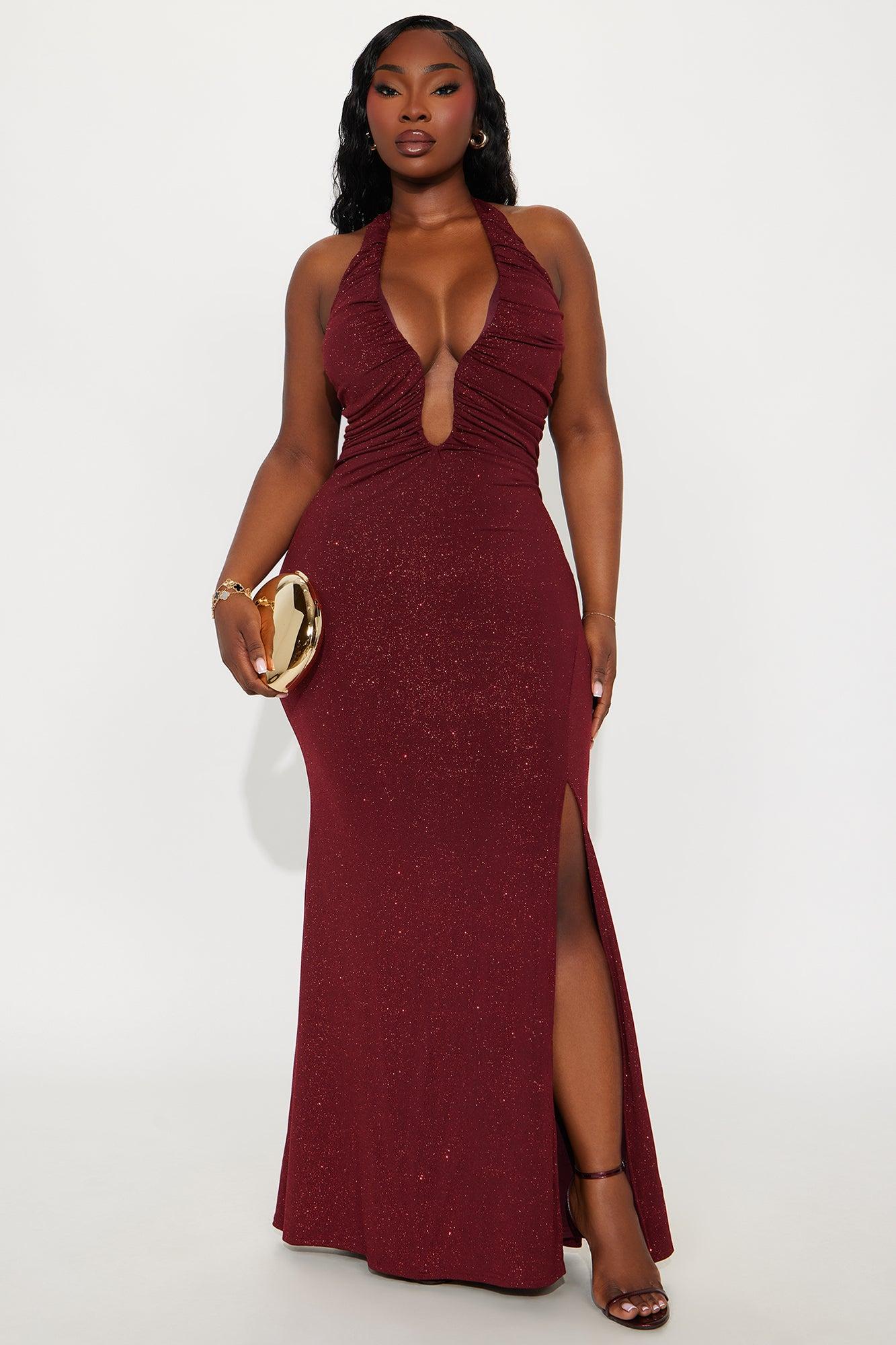 Raegan Glitter Halter Gown - Burgundy Female
