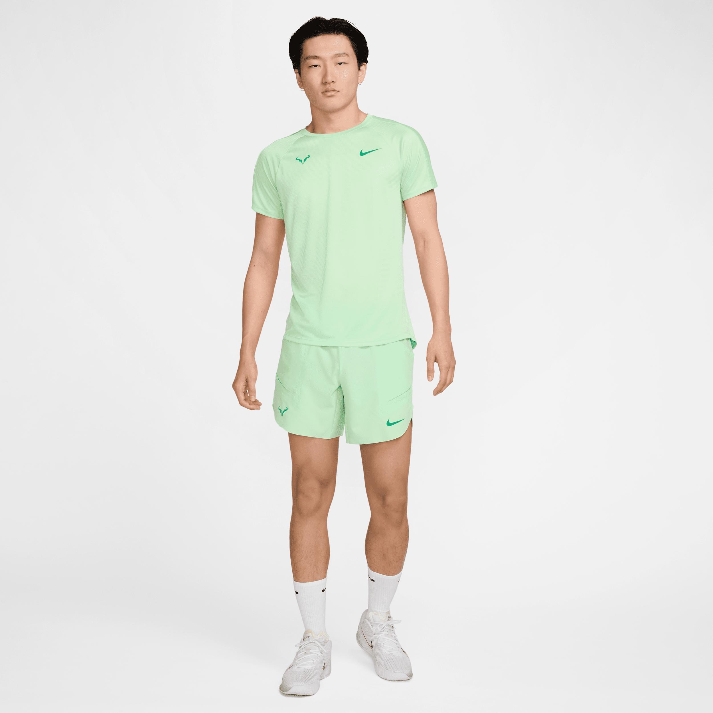 Perform like a champion with the sweat-wicking Rafa Top. We used stretchy, breathable fabric for cool that keeps you moving. It also offers a sleeve design that feels smooth and natural through your swing so you can focus on playing at your best, match after match. Benefits:Nike Dri-FIT technology moves sweat away from your skin for quicker evaporation, helping you stay dry and comfortable. Breathable knit fabric is stretchy so you can swing and move without a hitch. We used insights from Rafa to create a sleeve design that feels smooth and natural through your swing. Product Details:Rafa Bull logo. 100% polyester. Machine wash. Imported. Style: DV2887; Color: Vapor Green/Stadium Green; Size: L; Gender: Male; Age Group: Adult | Rafa Challenger Men's Nike Dri-FIT Short-Sleeve Tennis Top in Green, Size: Large | DV2887-376