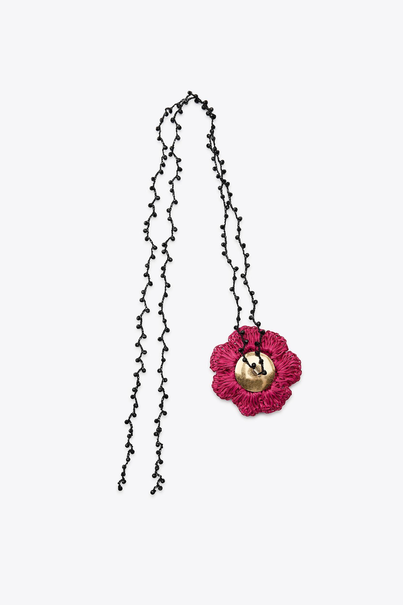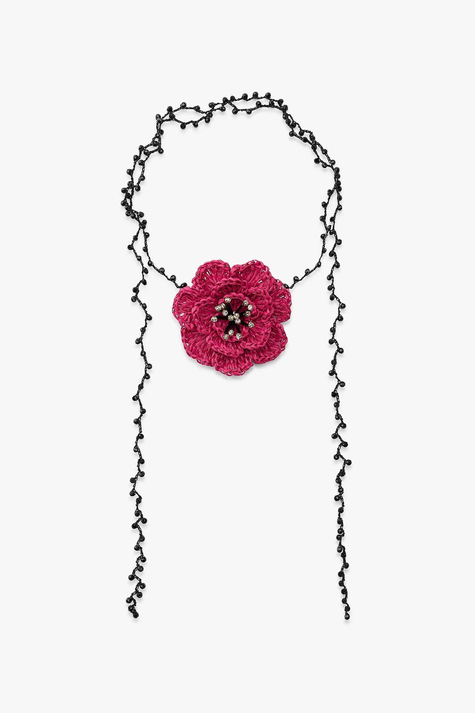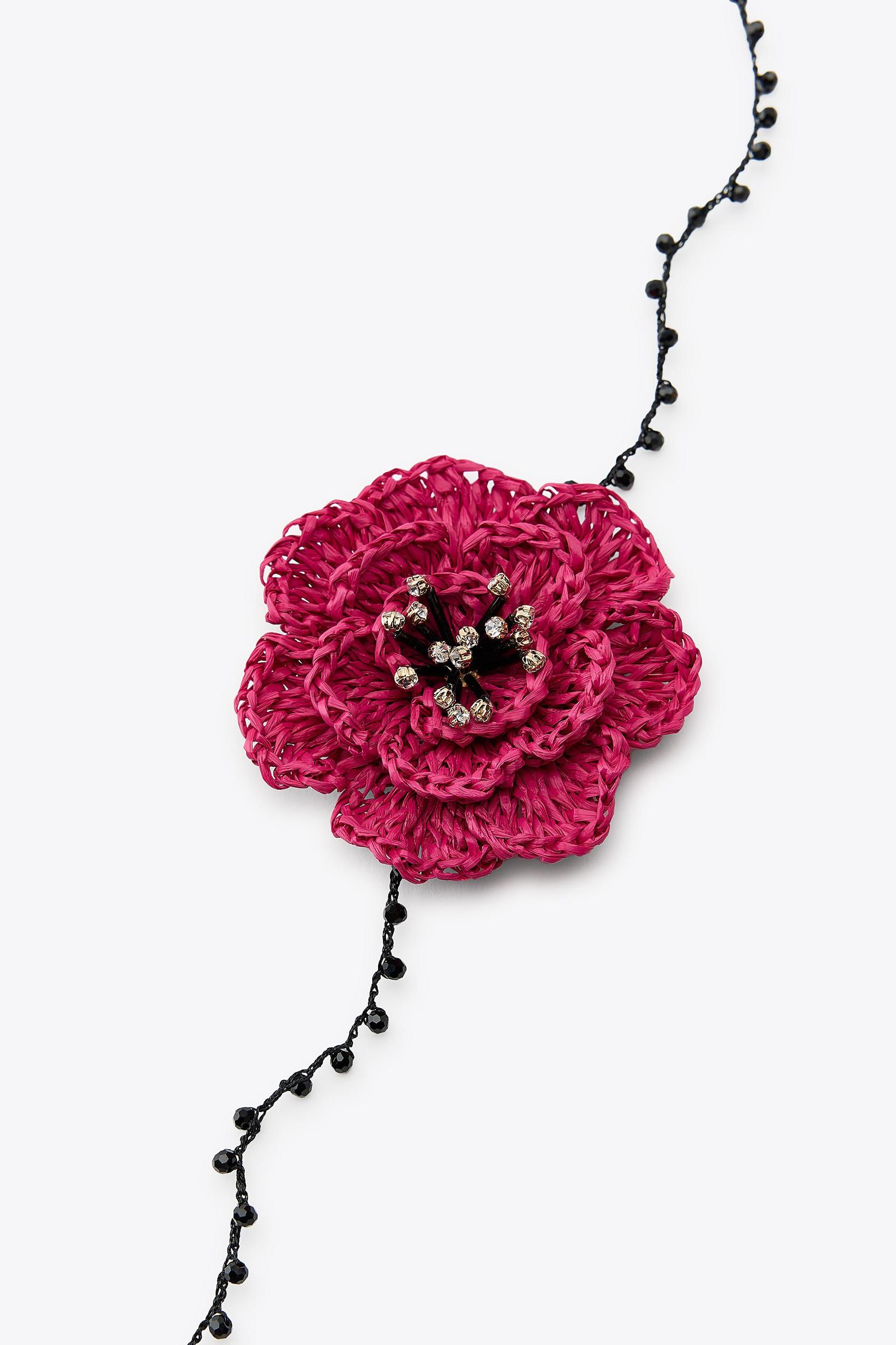 Choker necklace with a raffia flower pendant. Embellished with contrasting beads and glitter. Tie closure.