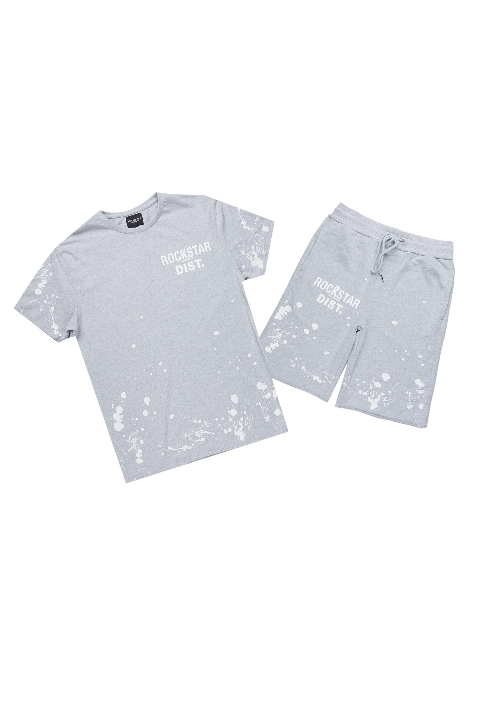 An urban two-piece athleisure tee and short set for men in heather grey. Designed with organic cotton and custom detailing for a lightweight everyday set. Crew neckline Short sleeves Pullover style Relaxed-fit Drawstring waistband Mid-rise waist line Dual slant pockets Barrel-leg trousers Printed RSO logos Custom paint splatter